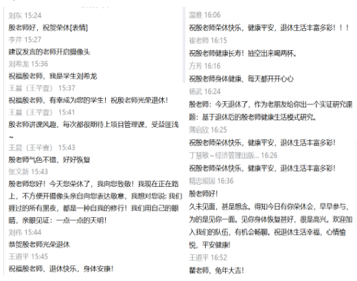 殷老师动情地发表了荣休感言,一度哽咽,尽管对工作岗位充满不舍,但殷老师依然无私地希望将更多的机会留给年轻人。在自由交流环节,学院杨武老师、杨青老师、张俊光老师、戴淑芬老师、何润宇老师、刘明珠老师、朱晓宁老师等回顾了与殷老师共事的难忘瞬间,表达了对殷老师最美好的祝愿。殷老师的学生们也争相发言,回忆了读书期间和殷老师相处的难忘点滴,分享了从殷老师那儿学习到的做人、做事、做学问的道理,以及殷老师对自己人生的重要影响,纷纷表达了对殷老师的良好祝福。