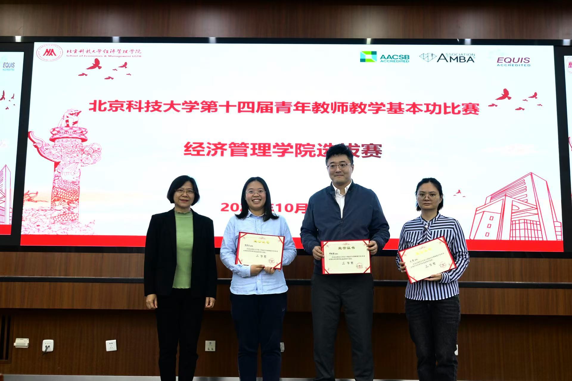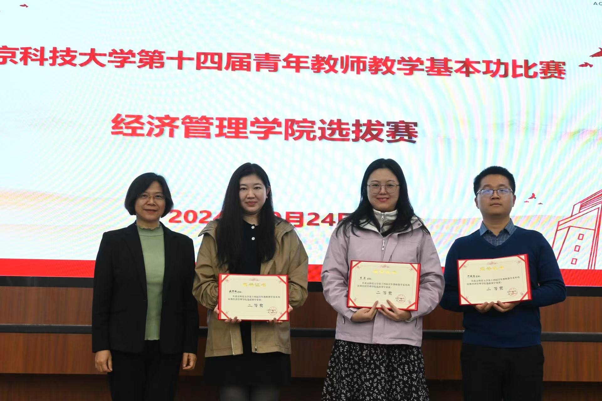 专家评委和学生评委从课程总体设计、教学内容、教学方法、教学仪态、教案及板书和教学效果与特色等方面对参赛教师进行了客观评价,共评选出一等奖4名、二等奖4名、三等奖4名。学院教学副院长范小华老师宣读了比赛成绩,学院党委书记武森为获奖教师颁奖并合影。