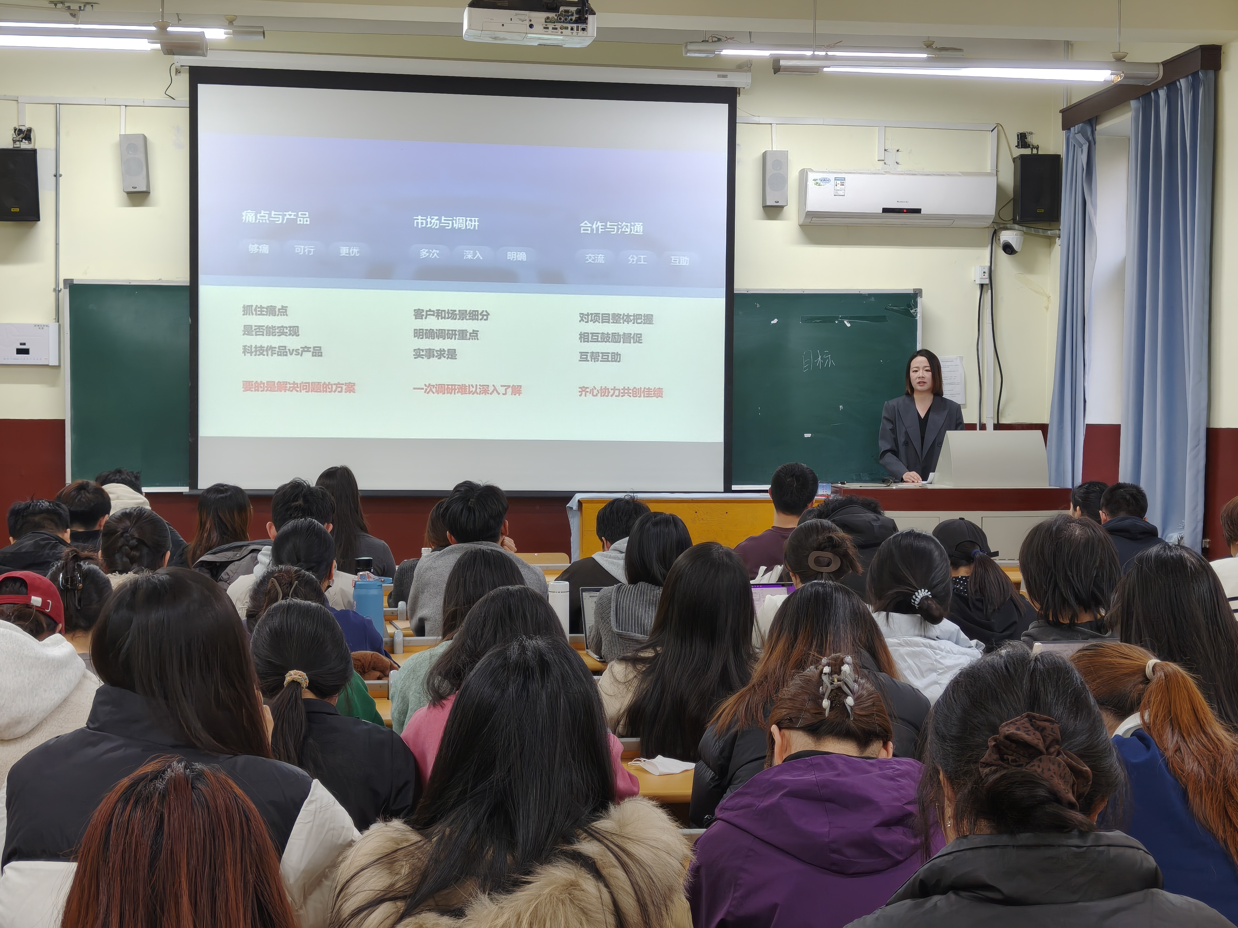 朱亭葶以“项目调研—产品设计—商业计划书—路演答辩”为主线,分享了其在科技竞赛方面的个人经验。她鼓励同学们“从模仿开始,大胆尝试”,在实践中不断迭代思路、完善表达,逐步构建起项目的完整框架与竞争力。