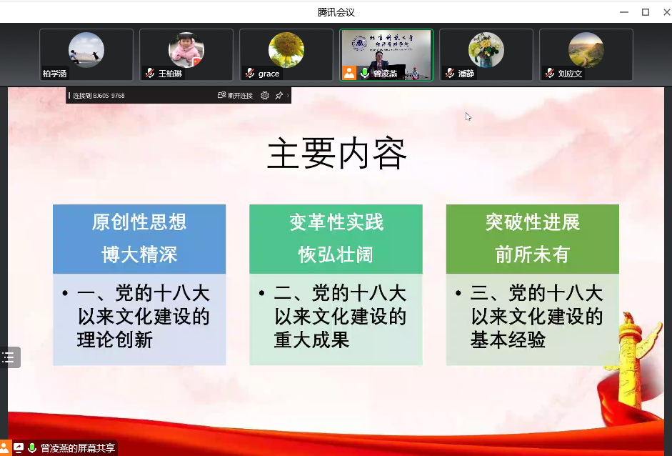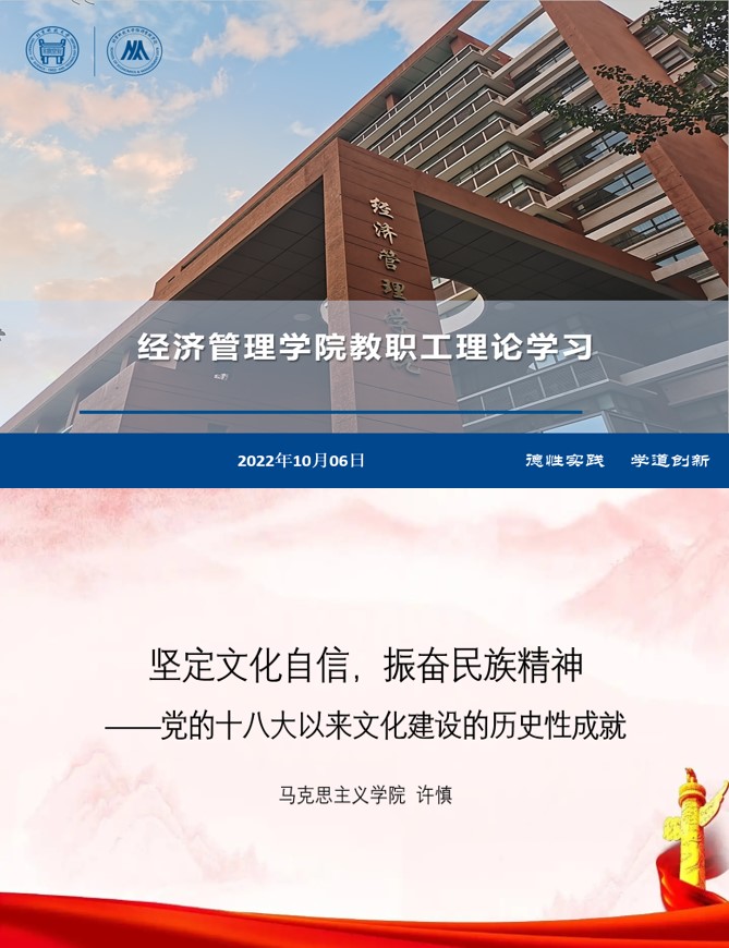 为深入学习贯彻习近平新时代中国特色社会主义思想、党的十九大和十九届历次全会精神,弘扬伟大建党精神,充分宣传展示党和国家事业取得的历史性成就、发生的历史性变革,进一步振奋精神、凝聚力量,在党的二十大召开之际,根据学校党委开展“新时代新成就”宣讲活动的工作安排,2022年10月6日下午,H片 组织全院教职工理论学习,开展《坚定文化自信,振奋民族精神——党的十八大以来文化建设的历史性成就》专题宣讲活动。本次学习活动邀请了学校马克思主义学院许慎副教授做主题宣讲,以线上和线下形式结合进行,学院全体院领导、党委委员和教职工党支部书记在经管楼809参加学习,学院全体教职工在线上参加学习,会议由学院党委书记武森主持。