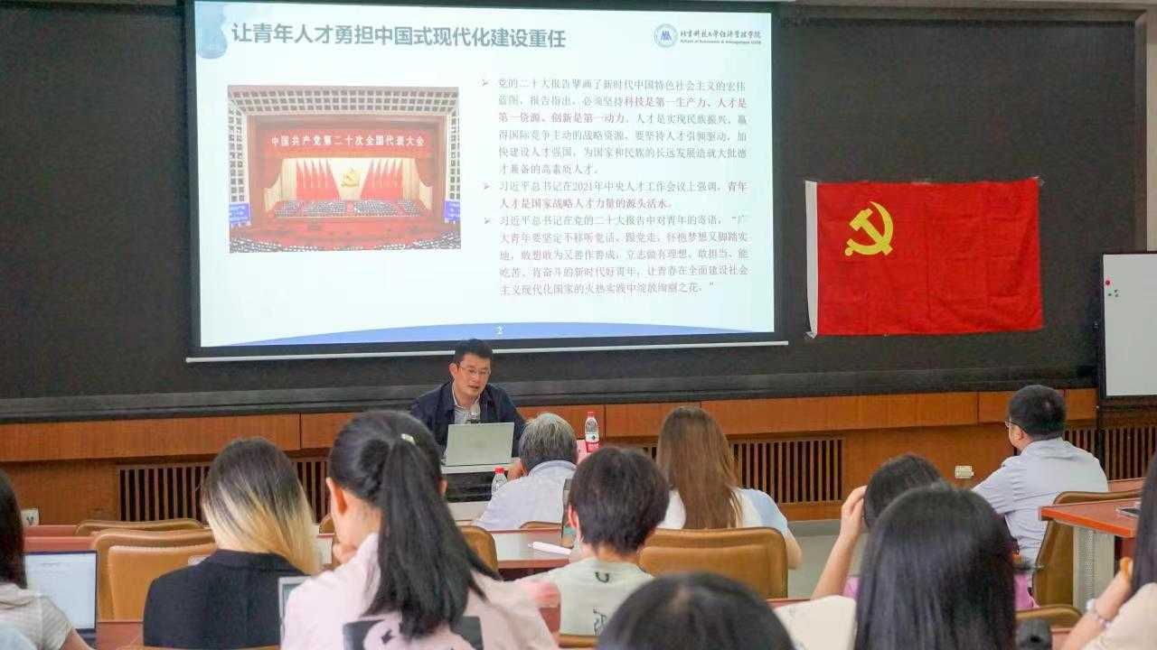 5月30日下午,“学习贯彻习近平新时代中国特色社会主义思想,做听党话、跟党走、有理想、有本领、具有为国奉献钢筋铁骨的高素质人才”主题党课在经管楼405举行,学院院长谷炜主讲,本科低年级党支部党员和积极分子参加学习。