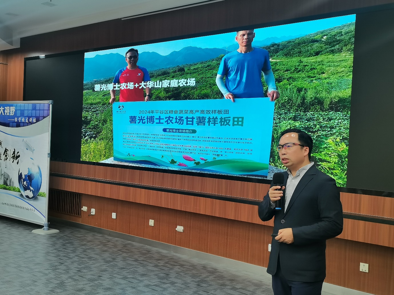 随着实践经验不断积累,他逐渐明确方向,决定“做减法”——聚焦真正想深耕的产业,在正确的赛道上持续发力。2023年6月6日,他在首届平谷区“博士农场”招商推介会上展示贤王庄村薯光“博士农场”,将科学种植与品牌农业的理念推向更广舞台。