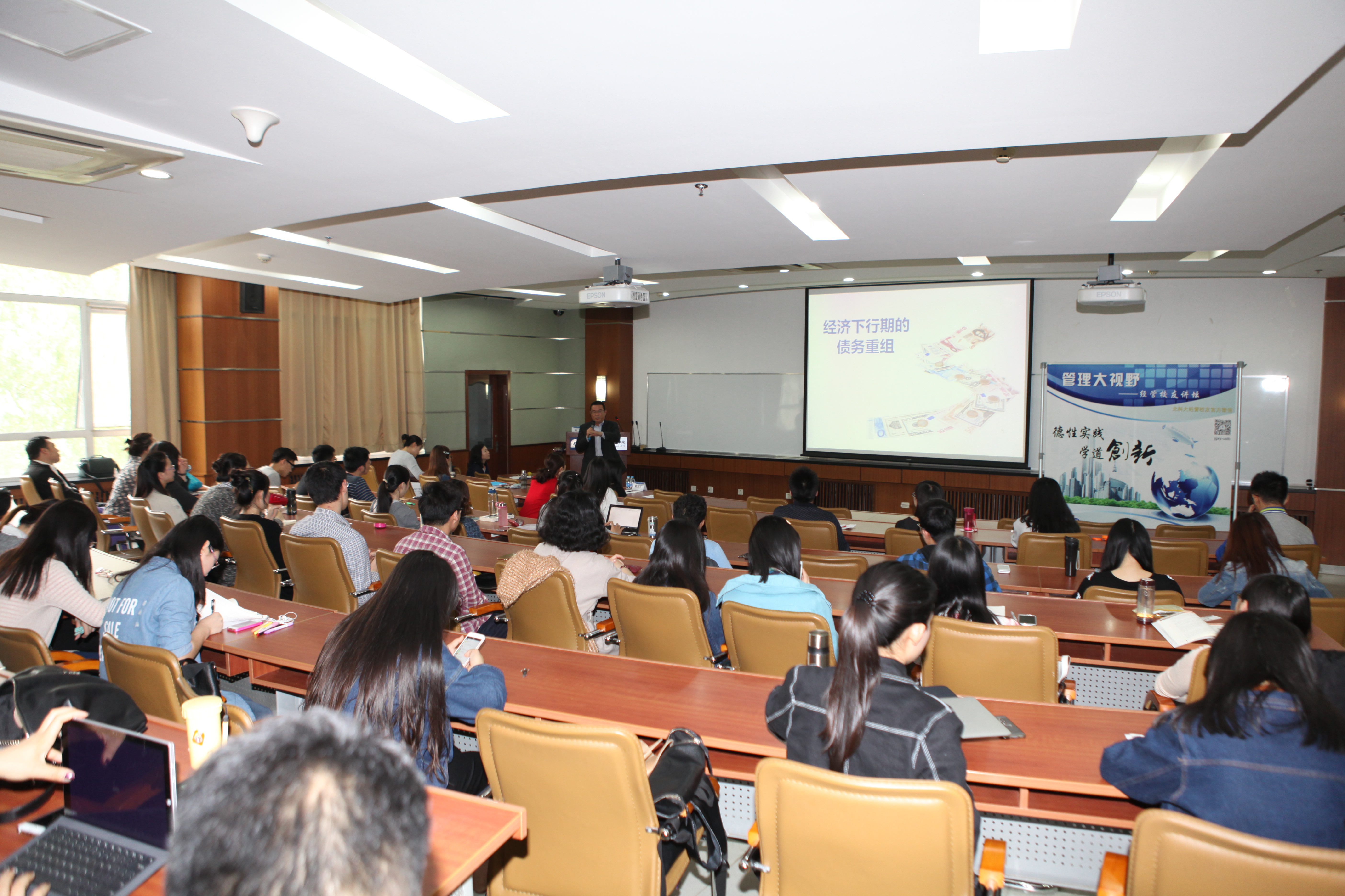 2016年4月27日,东凌H片 35周年院庆纪念活动之“管理大视野—经管校友讲坛”第十三讲在经管楼312教室举办。本期讲座主题为“经济下行期的债务重组”,主讲嘉宾为学院管工83级校友赵伟。赵伟校友是德勤(Deloitte)中国合伙人,拥有超过二十五年的投资、并购、企业重组及信托等工作经验,曾就职于中国农村信托投资公司,英国机场公司(BAA),气候变化资本集团(CCC)等机构。