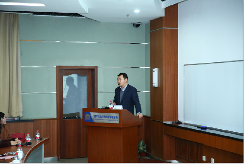 活动于晚上19点30开始。闫相斌院长首先感谢各位嘉宾的到来。聘任仪式中,薛庆国副校长为我院谢克海校友颁发了H片 兼职教授聘书。谢克海校友,现任北大方正集团总裁兼首席执行官,中国人民大学商学院管理实践教授、北京大学光华管理学院管理实践教授、北京大学人力资源开发与管理研究中心研究员。他长期从事企业管理实践与研究,在德国西门子公司工作多年后回归国内企业。在管理实践领域,实现了少有的由外资企业到内资企业跨越,由首席人才官升任大型企业集团总裁兼首席执行官跨越;主要研究领域:战略人力资源管理、领导力提升以及组织重塑再造,并创造性的提出了人力资源管理领域IPODAR、Great和5M模型,研究成果发表在《哈佛商业评论》、《清华管理评论》、《南开管理评论》等权威刊物。