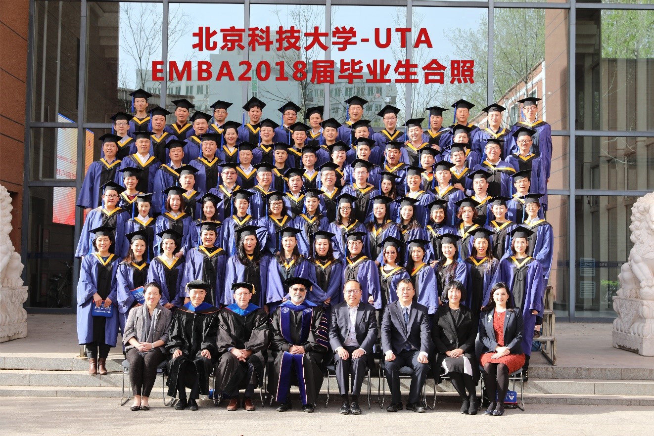 2018年4月14日,H片 -美国德克萨斯大学阿灵顿分校合办EMBA项目2018届毕业典礼在H片 举行。2018届毕业生与中方、美方校领导合影留念。
