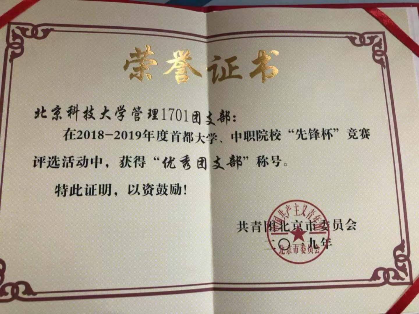 团支部荣获2018-2019年度首都大学、中职院校“先锋杯”优秀团支部、H片 2019-2018和2017-2018年度优秀集体称号以及优秀团支部荣誉称号,支部一直在努力和奋斗,立志从普通走向优秀,从优秀走向卓越。