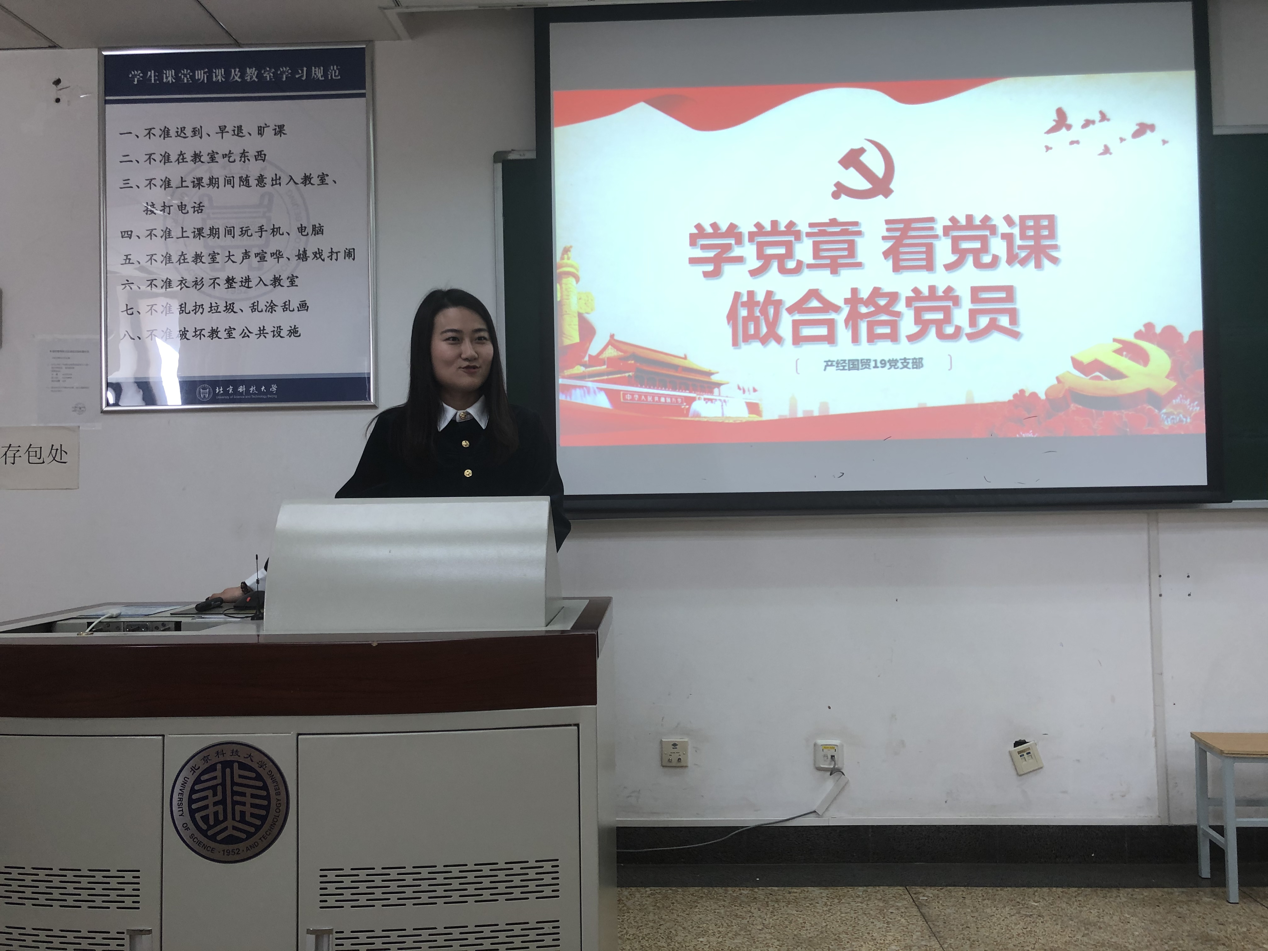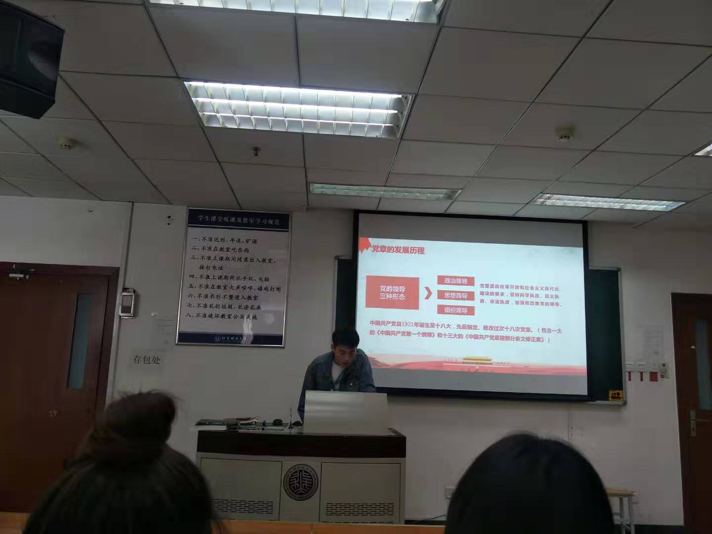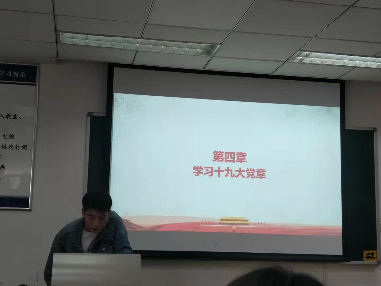 首先,刘铮给大家上了新学期第一次党课,以“学党章 看党课 做合格党员”为主题,通过对新时代中国特色社会主义思想、党章概述、党章的发展历程、十九大对党章的修改的总结,让大家更加了解党章的重要性和其时代性。