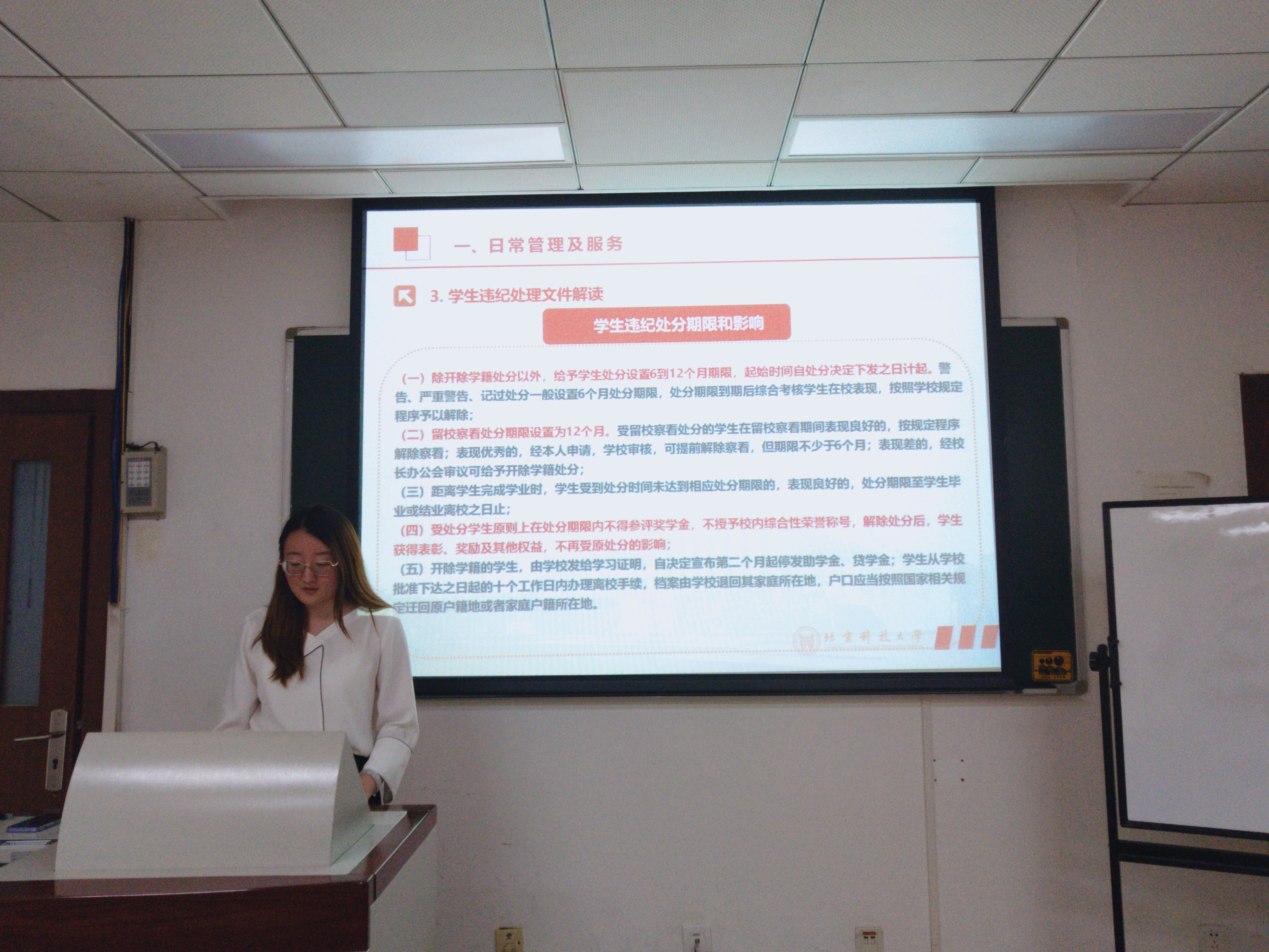 首先孙鑫老师从日常管理及服务的角度,为大家讲解了请销假制度和保险制度,以及学生违纪处理制度。强调了疫情特殊时期请销假制度的流程及审批重要性,解读了学生保险的类型及申请流程。着重解读了学生违纪处理文件,结合近期的某重点大学学生拘留事件,尤其强调了提升大学生法律意识的重要性,要求大家遵守法律法规、校规校纪。