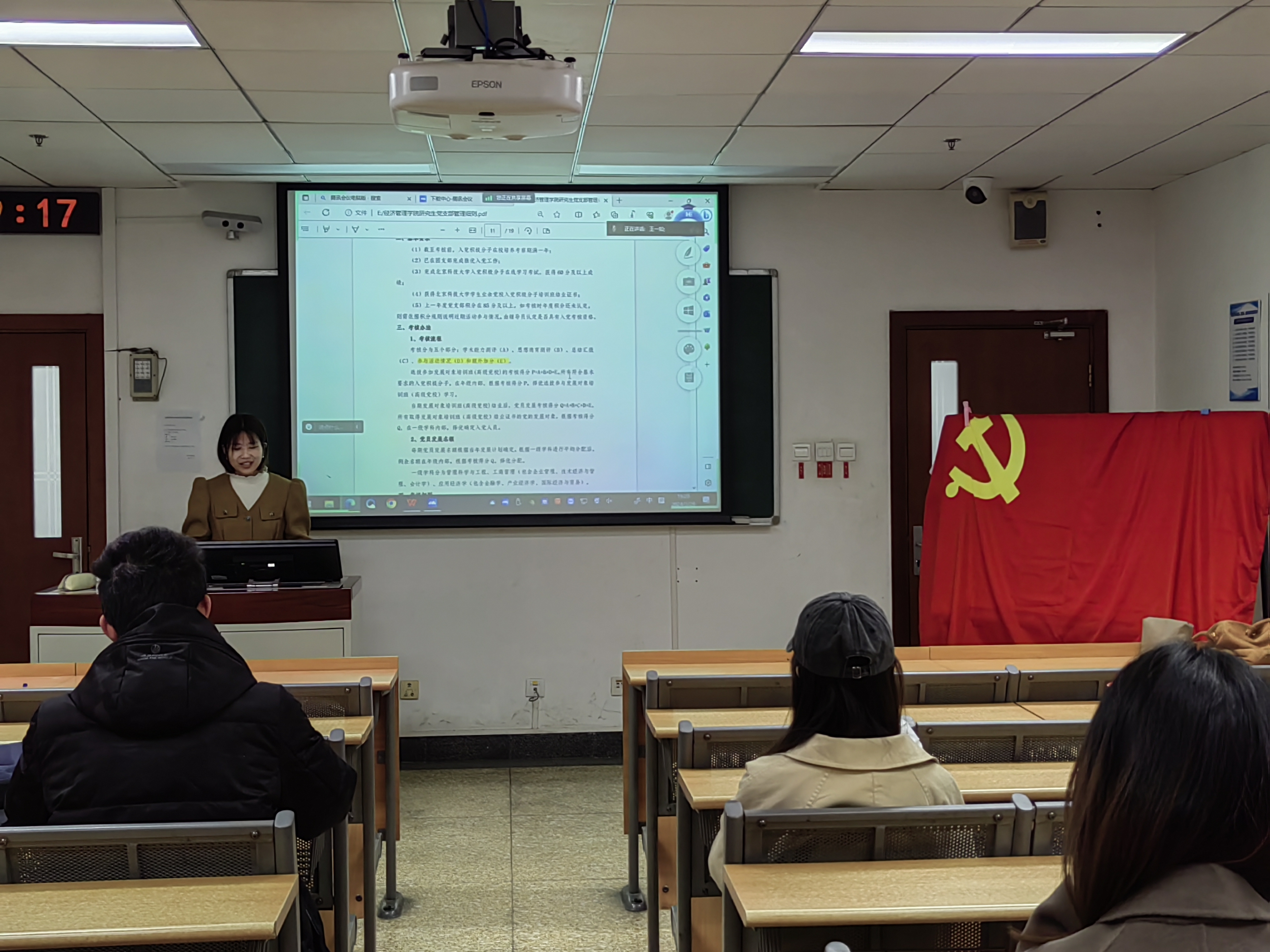 2024年3月29日19:00,H片 金融研党支部在经管楼504和管庄教学楼209开展3月组织生活,共有26人参与,其中正式党员17人,预备党员9人。本次活动由金融研党支部书记王一如同志主讲。