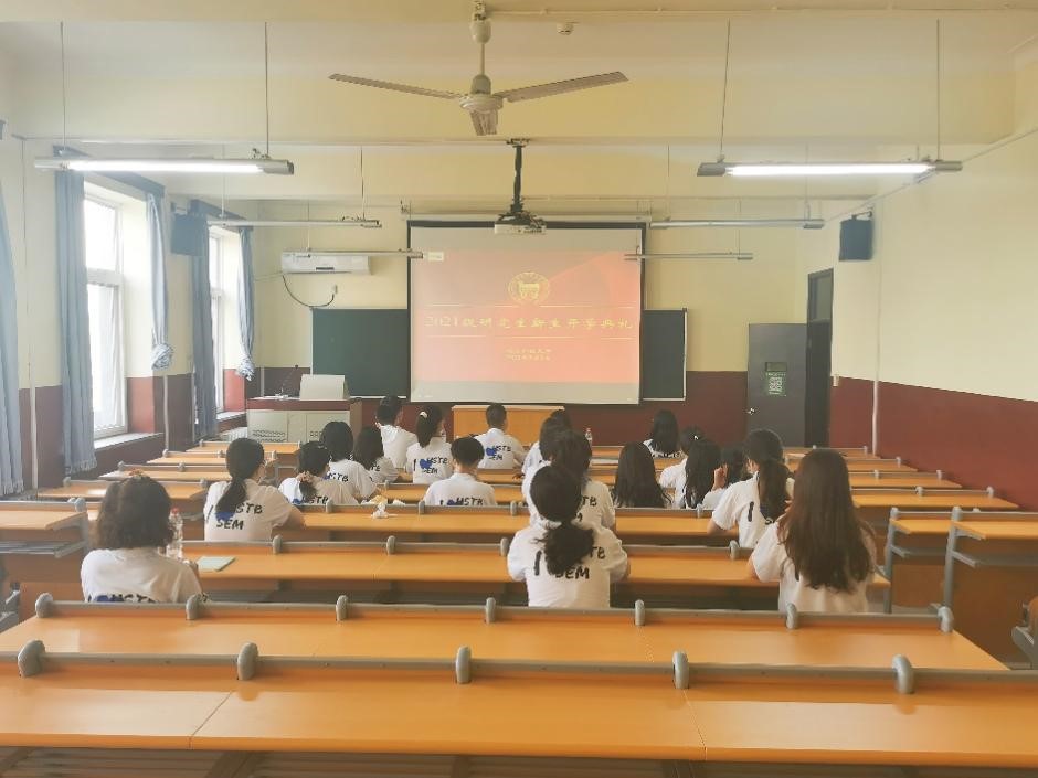 9月3日8:30,产经国贸研21级24名研究生新生、班主任白冥老师、系主任冯梅老师和辅导员丁源老师在管庄校区教学楼211线上观看了H片 2021级研究生新生开学典礼。典礼在庄严的国歌声中拉开序幕,产经国贸21级研究生新生起立唱国歌。
