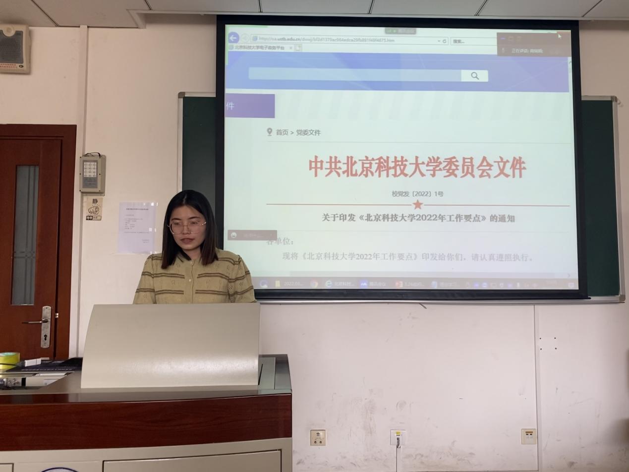最后,与会同志随后就学习内容展开了深刻讨论,并发表自己的学习心得。李笑妍同志表示,作为新时代的青年,将牢牢把握新时代下我国最新的发展战略,好好学习科学文化知识,随着国家的发展和进步不断强化自己在学科领域的认知,争取有所贡献;刘璐同志表示,身为北科的一份子,将积极学习学校各级会议精神,配合学校工作,为学校“双一流”建设贡献力量。坚持创新,敢于创新,配合国家实际发展需求与学校增强科研创新的要求,把论文写在祖国的大地上。