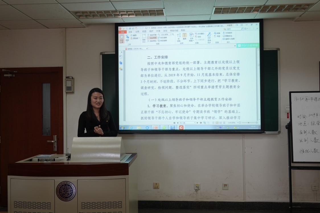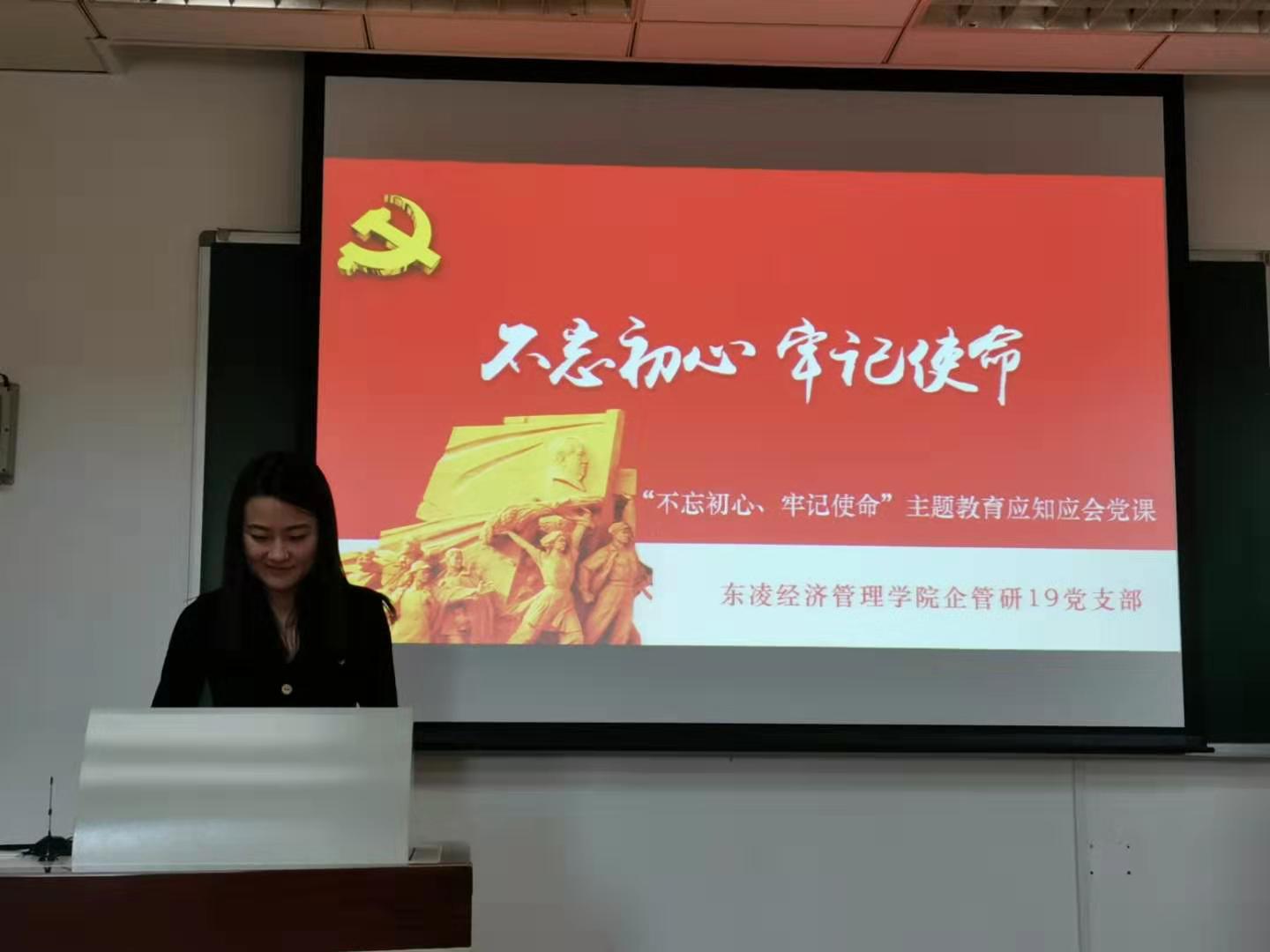 为响应在全党开展“不忘初心、牢记使命”主题教育的号召,根据“不忘初心、牢记使命”主题教育工作方案,10月25日下午,东凌H片 企管研19党支部于管楼504开展“不忘初心、牢记使命”主题教育应知应会党课,并邀请2019级研究生辅导员李响为全体支部成员进行讲解。