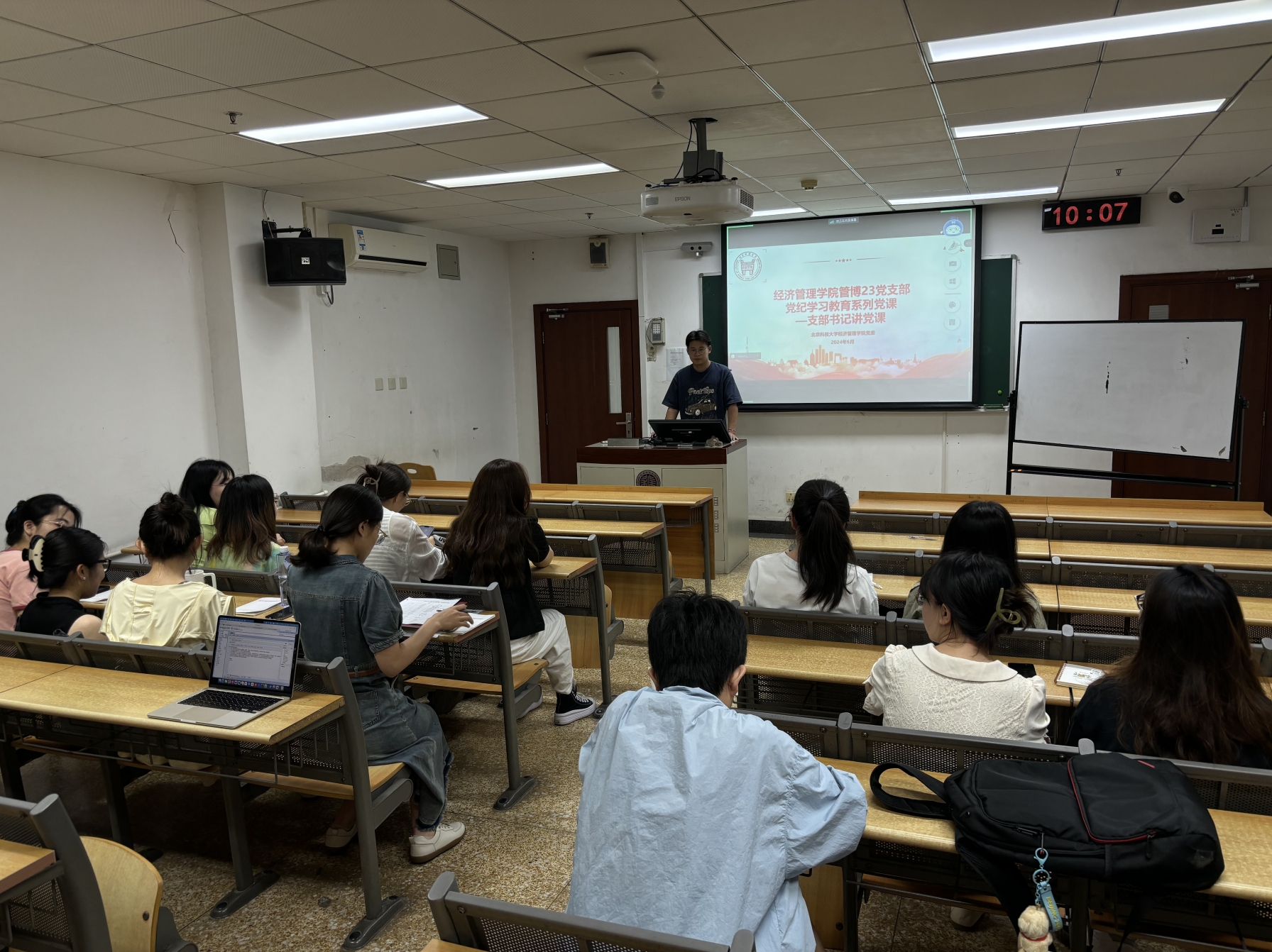 2024年6月14日10:00,H片 管博23党支部在经管楼502顺利开展党纪学习教育专题党课。本次党课由支部书记张志强主讲,管博23党支部全体党员和入党积极分子参加。