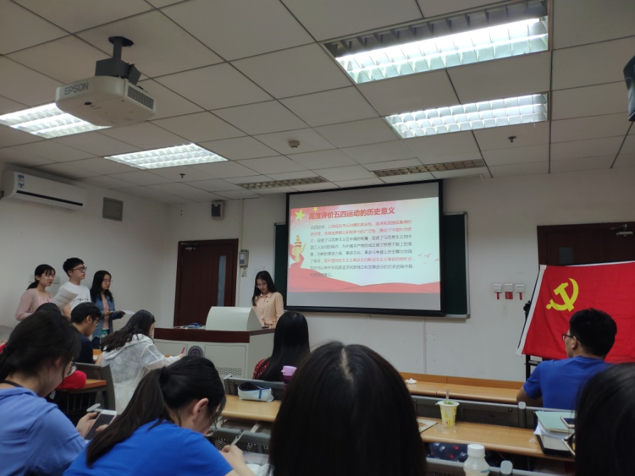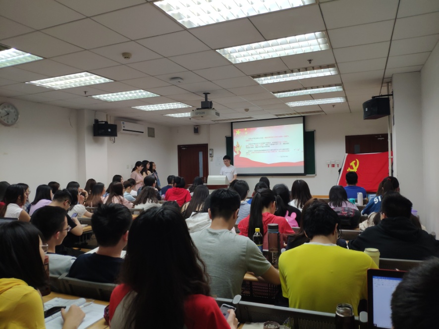 本次党员讲党课的主题为“五四精神”,4位预备党员根据习总书记在4月30日纪念五四运动100周年大会上的讲话,将本次党课分为四个板块:五四运动的历史意义、勉励新时代中国青年建功立业的要求、如何确保党的事业薪火相传和青春向党。在党课的尾声,低年级党支部不仅观看了一段习总书记的讲话视频,还在讲解人的带领下进行了由中国青年报举办的“新青年耀青春”的宣誓环节。