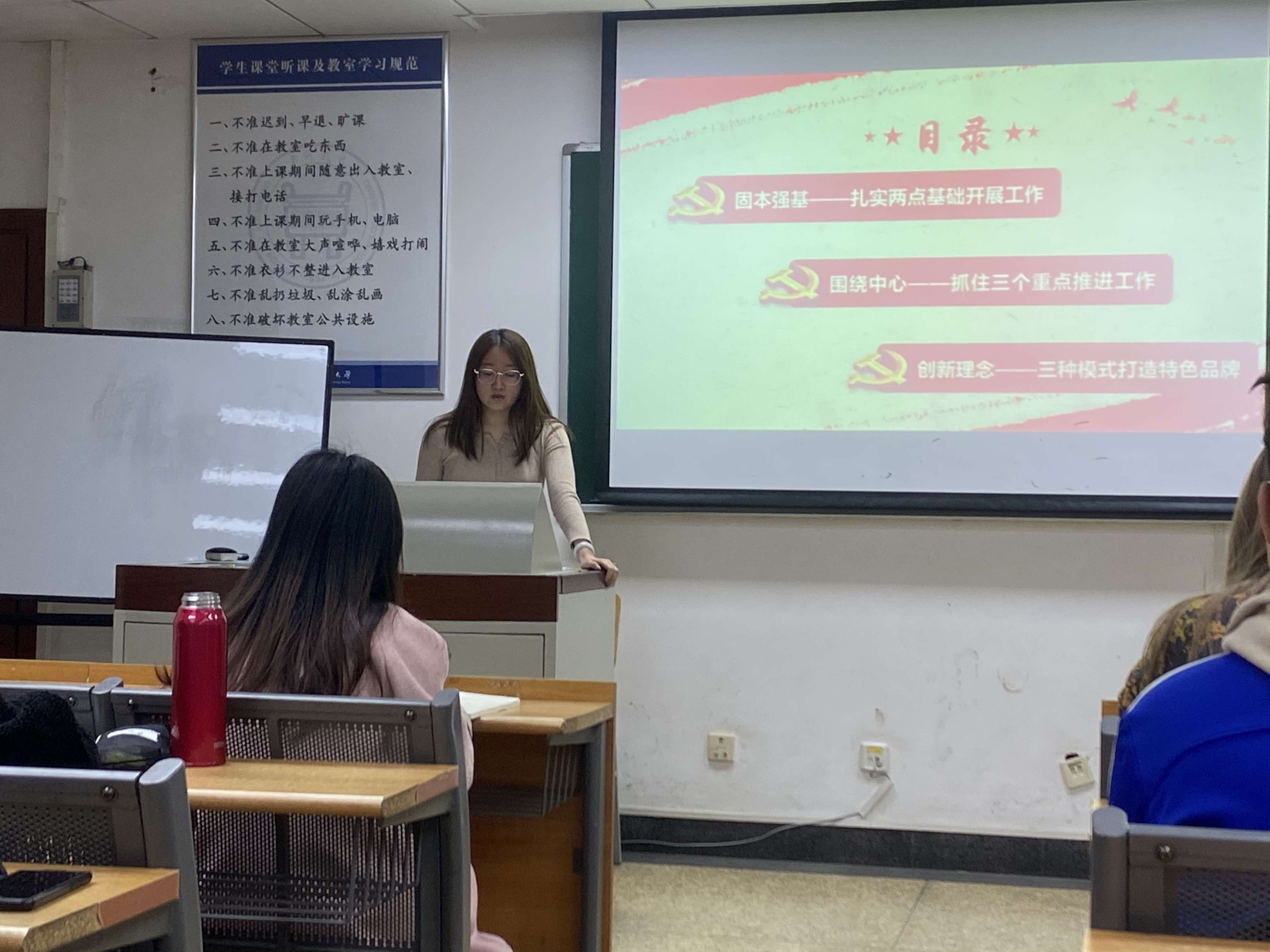 首先,党支部书记孙鑫进行党支部总结,提出自党支部成立以来,始终坚持扎实两点基础、抓住三个重点,创新三种模式、建好一个支部的初心,固本强基,围绕中心,创新理念,打造精品化党支部;并对党支部未来进一步发展提出整改措施。