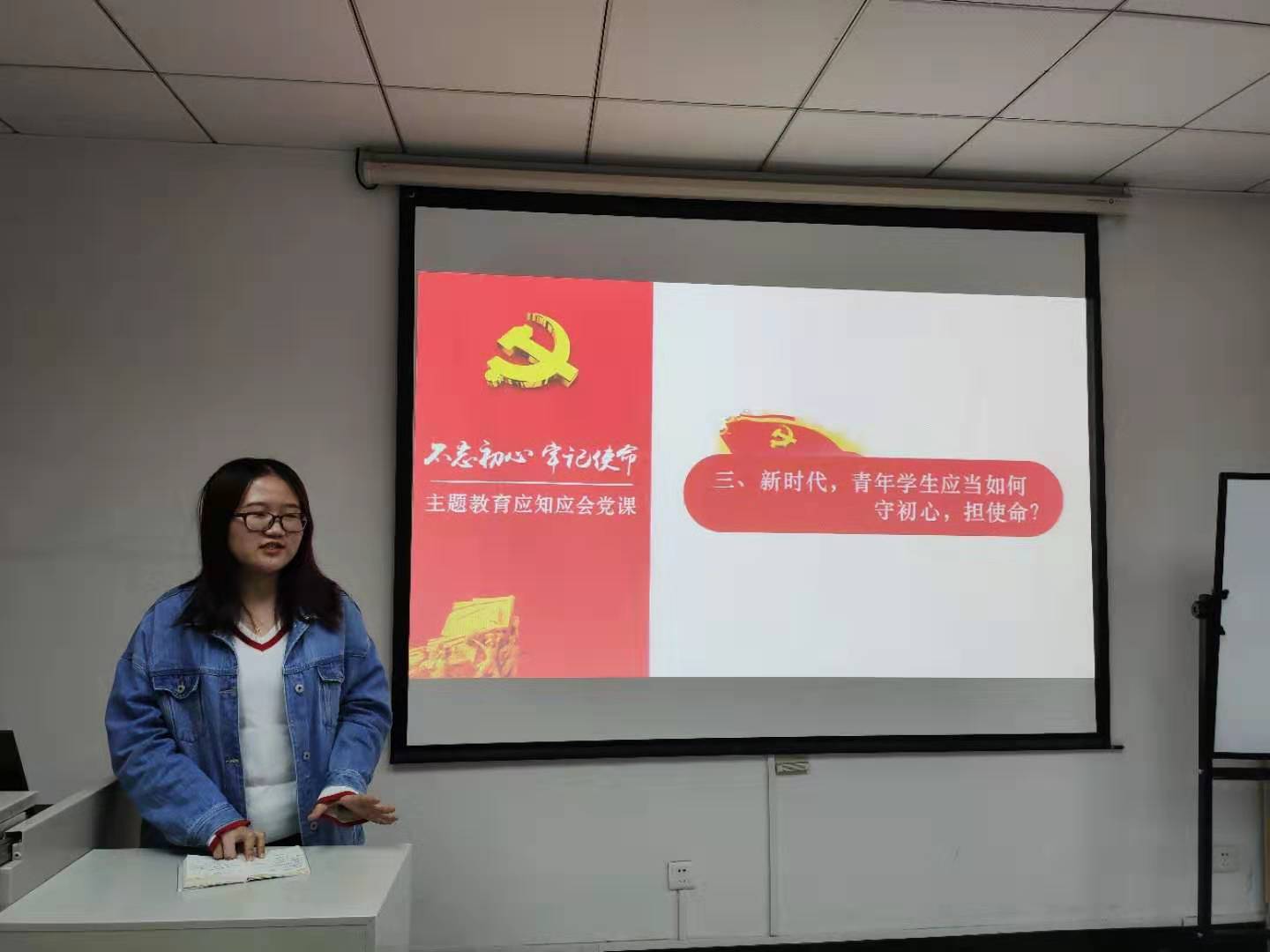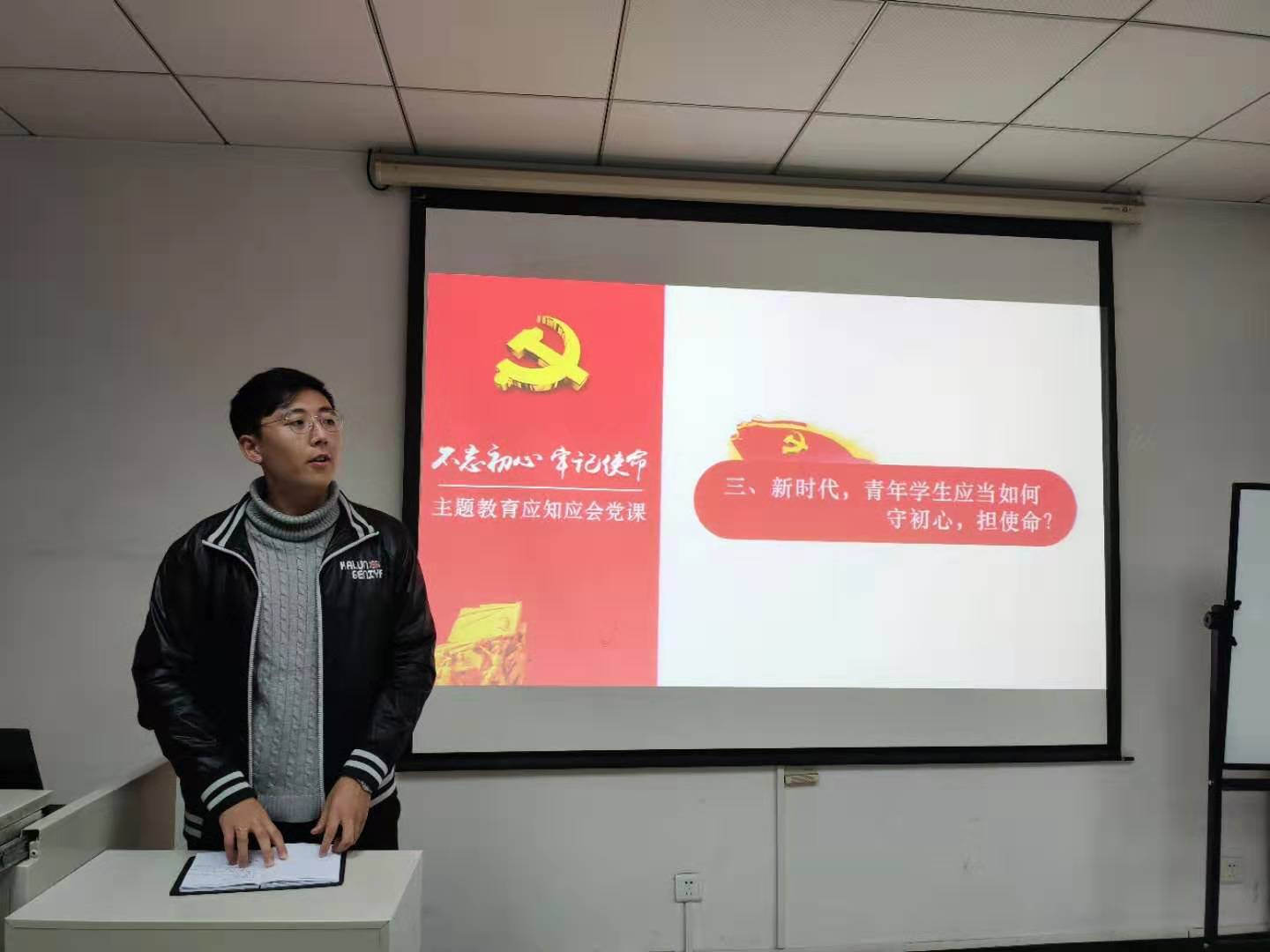 接下来,支部针对“新时代,青年学生应当如何守初心、担使命”进行了主题分享。首先辅导员借助习近平总书记在纪念五四运动100周年大会上的讲话,结合身边的具体事例向大家展示了新时代中国青年应该如何守初心、担使命。随后,各位支部成员分别结合自身情况,分享了对初心和使命的理解与感悟。