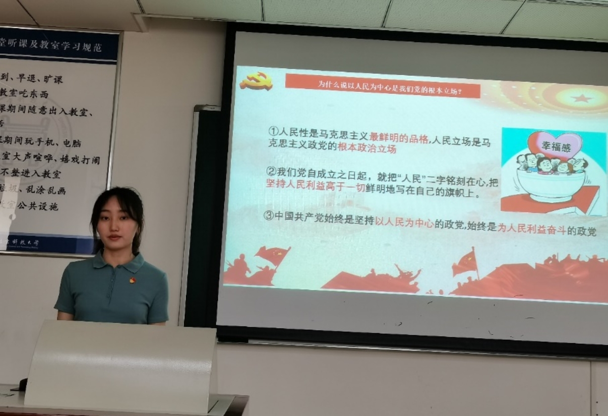 支部第四小组成员郝嘉睿、蒋周涛针对《习近平新时代中国特色社会主义思想学习问答》第三章初心砥柱天地间的六个问题作出了细致的讲解。首先,郝嘉睿同学从党的初心和使命是党的性质宗旨、理想信念、奋斗目标的集中体现、是加强党的建设的永恒课题、是我们党肩负起实现民族复兴历史使命的根本要求三个方面说明我们党作为百年大党,为什么必须始终牢记初心和使命。随后,支部成员蒋周涛从马克思主义政党的根本政治立场,党的性质和宗旨两个方面说明为什么人民对美好生活的向往就是我们党的奋斗目标,并带领大家通过视频学习了实现伟大梦想必须进行的伟大斗争、伟大工程、伟大事业。紧接着,他从党的指导思想、性质宗旨以及代表人民根本利益两个方面说明了只有中国共产党才能肩负起实现中华民族伟大复兴的历史使命。最后,主持人郝嘉睿表示在千变万化的社会中,只有深扎信念之根,才能抵挡住不良诱惑的影响,才能在激流险滩中破浪前行。她号召大家平时注意党性修养的培养,牢记初心、忠于初心、守住初心,不忘使命,为共产主义奋斗终身。