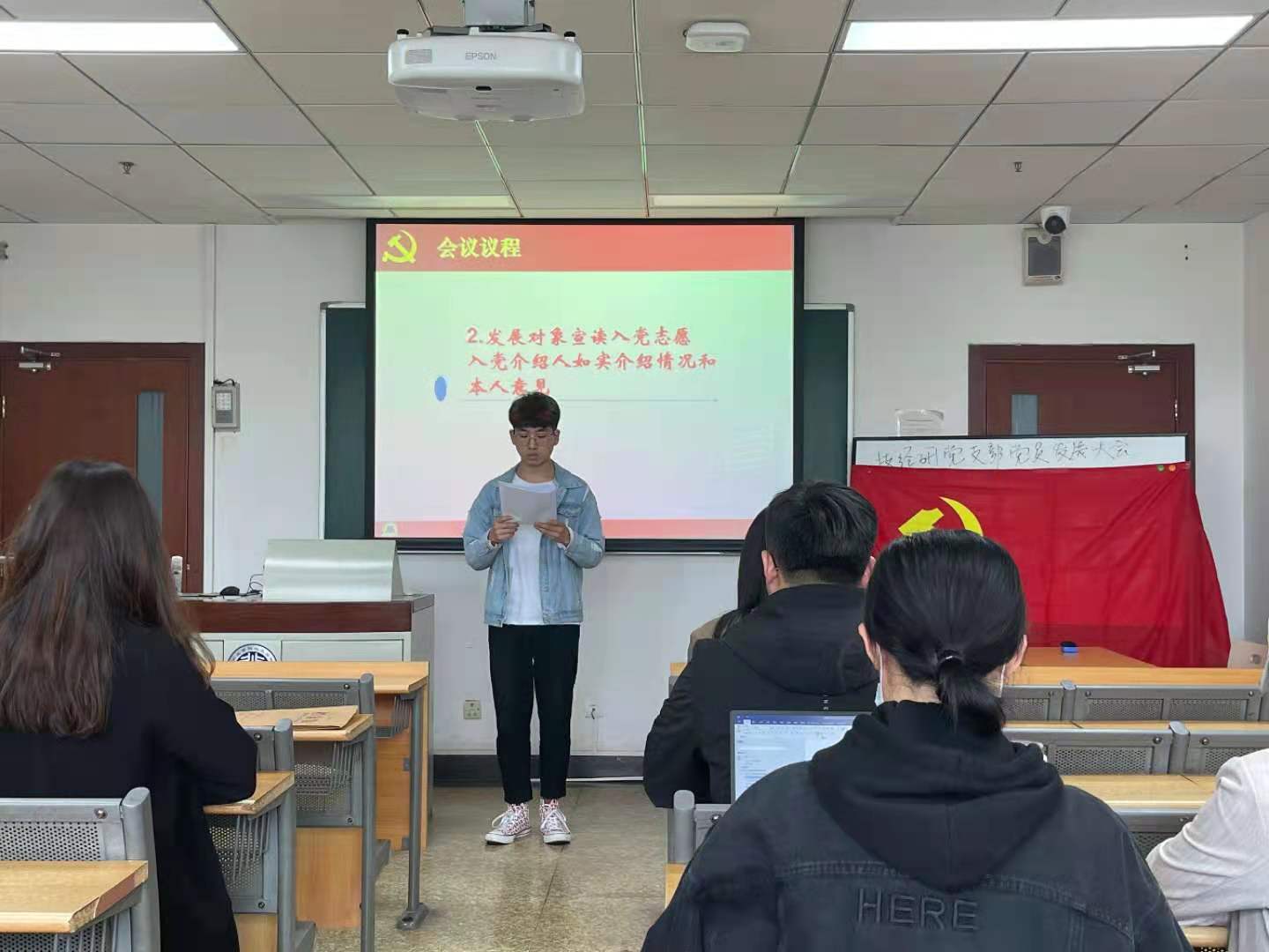 首先,全体起立,面向国旗,奏唱国歌。随后,发展对象常明星同志宣读入党志愿书,就其履历、社会关系等情况进行了汇报,表达了其对于加入党组织的热切期望。