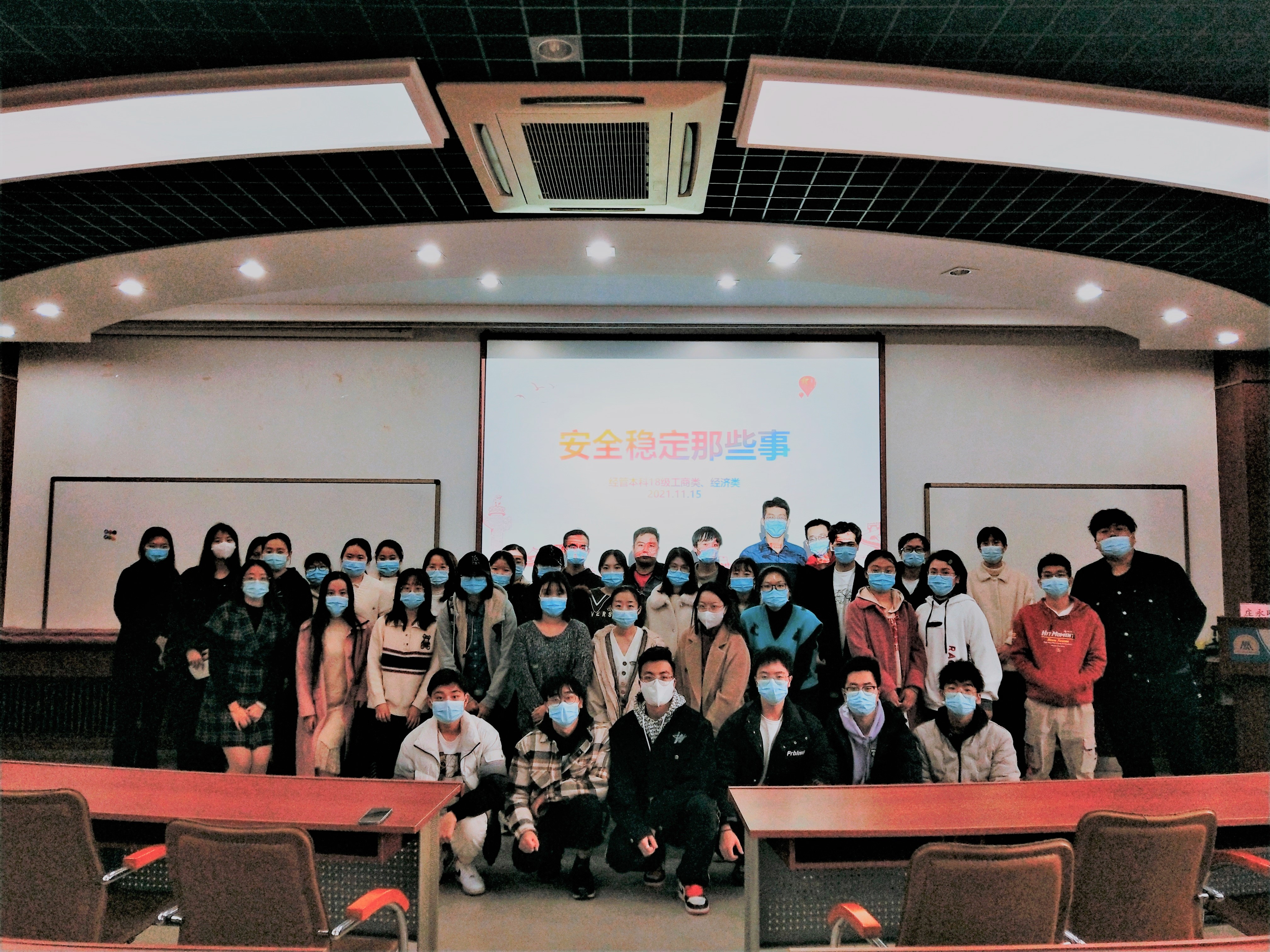11月15日下午15:00,为帮助经管本科18级学生增强安全防范意识,提高安全防范能力,普及校园安全常识,H片 18级会计,工商,国贸及金融等六个专业班采用线上线下相结合的形式,开展了以“安全稳定那些事”为主题的安全稳定会。校保卫保密处庄永刚老师、经管本科18级辅导员孙鑫老师参加本次会议。