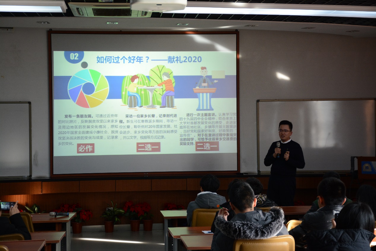 随后,张洪榛介绍了寒假在大学生涯里面的地位和重要性,布置了写一份简历、发一条记录家乡变化的朋友圈等九项假期作业,并对每项作业的完成给予了方法指导,希望同学们寒假生活过得更加有意义。