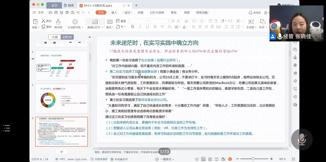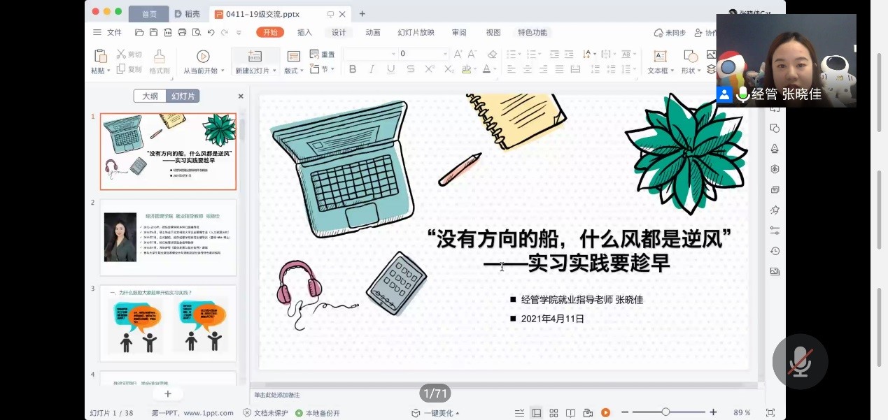 4月11日19:30,H片 就业指导老师张晓佳面向本科19级学生开展“静待佳音”职业生涯规划直播分享会——“实习实践要趁早”,参与活动的有本科19级辅导员戈誉阳、张洪榛以及全体本科19级学生。