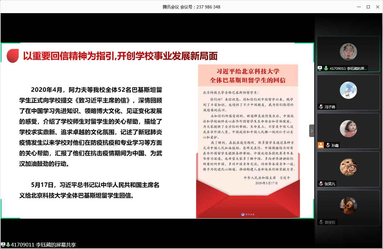 会议的第一部分,由王灏、李钰葳带领大家学习习总书记重要回信精神。在学习中,两位同学带领大家重温习主席给H片 全体巴基斯坦留学生的回信,学习我校党委书记武贵龙、校长杨仁树就全面深入学习宣传贯彻总书记重要回信精神的部署与要求。