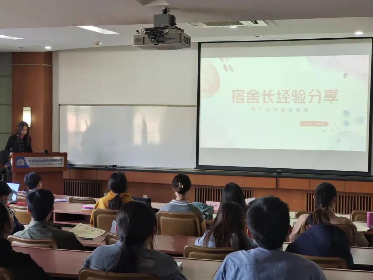 接下来是标兵宿舍长们的经验分享,三位优秀的学长学姐从宿舍团结,宿舍学风和宿舍安全卫生几个方面对学弟学妹们进行了经验分享。团结是一个宿舍的基础,室友们相互理解,互帮互助,团结友爱是宿舍建设的前提保障。学习仍然是大学生的主要任务,宿舍长应该积极带动宿舍成员学习讨论,督促室友们好好学习。宿舍安全的重要性不言而喻,尤其要注意宿舍用电安全。宿舍卫生需要大家共同维护,提供良好的生活环境。