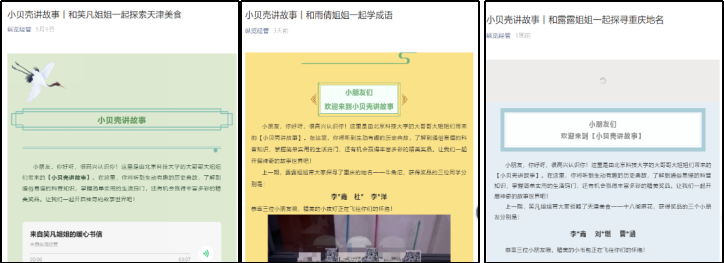 目前【小贝壳讲故事】节目已开展三期,有天津的传统美食十八街麻花的介绍,有重庆地名牛角沱的来历,有发生在河北邯郸的趣味故事—邯郸学步,每一期的故事主题、内容均为学生党员原创作品,充分结合学生家乡的历史典故、传统习俗、地域文化等,以生动有趣的话语体系,为小朋友讲好“成长故事”、“历史故事”、“中国故事”,在每期故事的结尾,精心设计了引发孩子们思考的小问题和实用的小礼物。活动给孩子们枯燥的住院生活带来新鲜趣味的同时,帮助孩子们扩宽视野,增长见识,传递积极向上的生活理念。