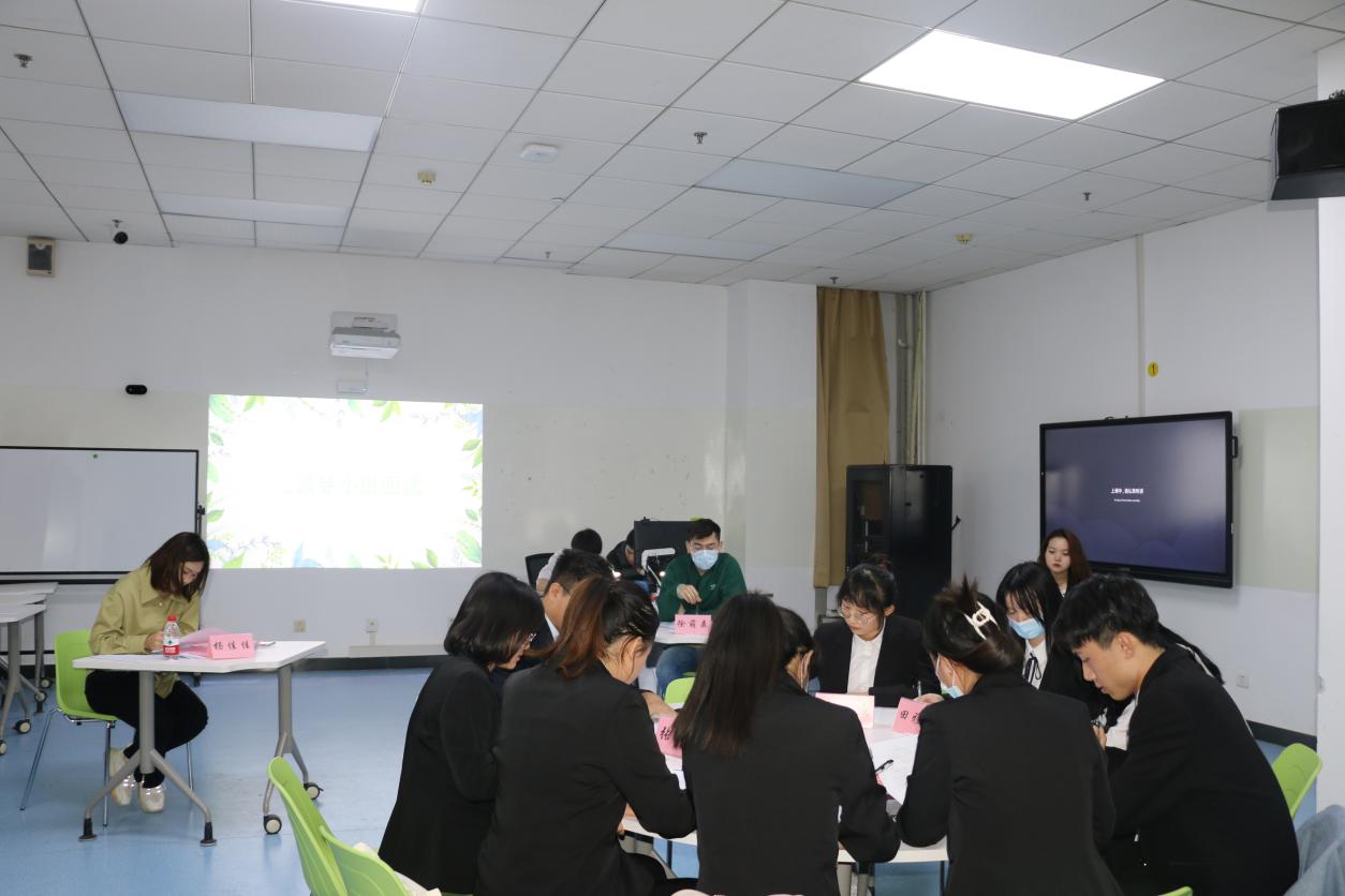 比赛开始前,主持人向大家详细介绍比赛的流程和规则。经过前期的简历报名,简历筛选后,进入无领导小组讨论环节。参赛选手分为三个小组,每个小组抽取一个题目,每组有四十分钟的时间,选手针对题目有独立思考的五分钟时间。在小组讨论环节,有的选手主动承担领导者角色,把控讨论时间,组织小组成员有序讨论,有的选手积极发表自己看法,展现独特风采,现场气氛紧张热烈,同时也有选手倾听其他组员发言,认真记录梳理。评委老师在每一个小组总结后对小组整体表现进行评价,再对选手的个人表现一一点评,提出针对性和建设性的意见。除了对比赛的点评,更是拓展到实际情况,使比赛和现实求职更加贴合。