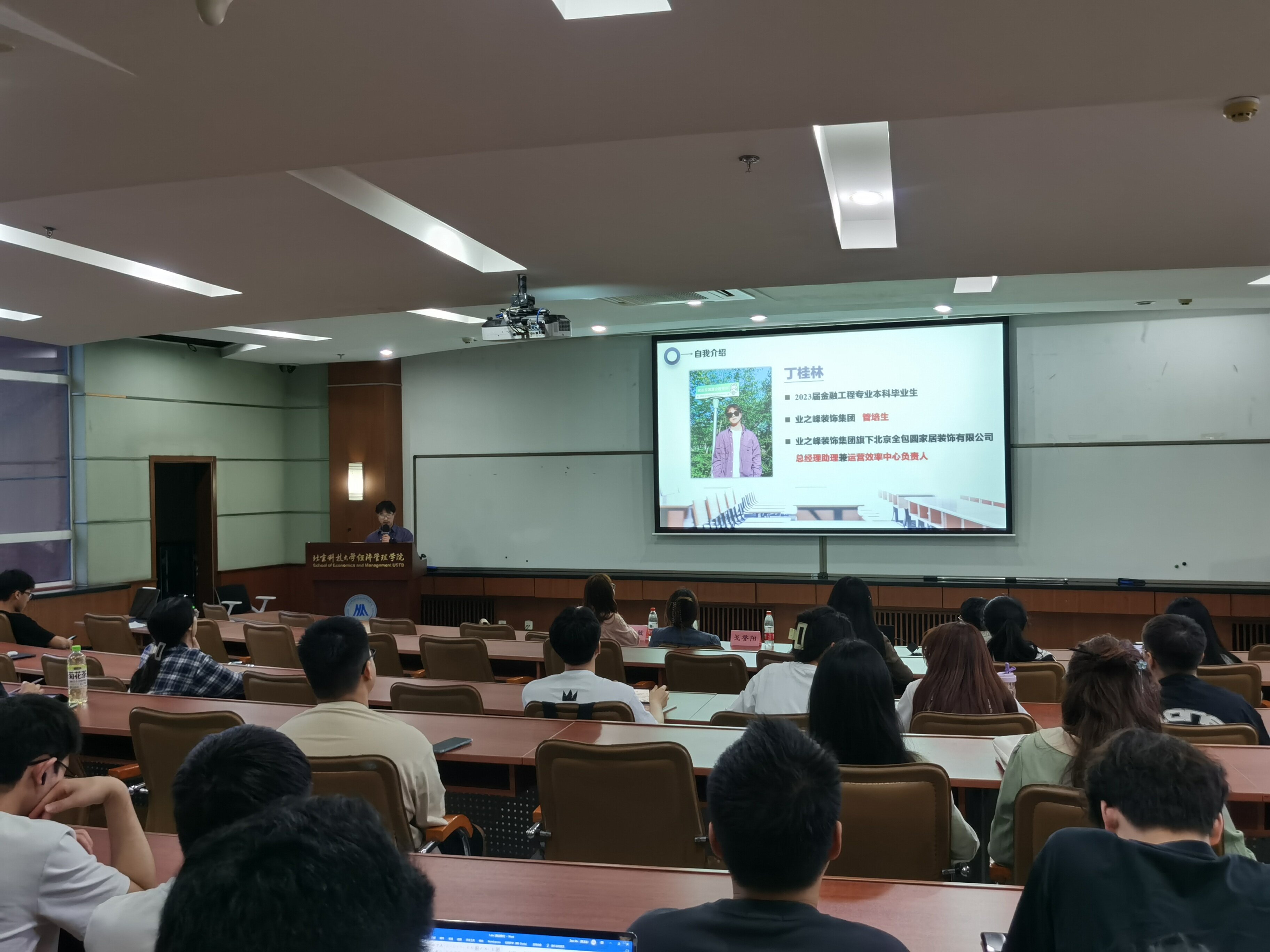 出席本次活动的嘉宾有学院就业指导教师戈誉阳;23届金融工程本科毕业生毛超敏,现任德勤华永会计师事务所(特殊普通合伙)北京分所风险咨询部分析员;23 届金融工程本科毕业生丁桂林,现任业之峰装饰集团旗下北京全包圆家居装饰有限公司总经理助理兼运营效率中心负责人,曾任业之峰装饰集团旗下北京全包圆家居装饰有限公司董事长秘书。