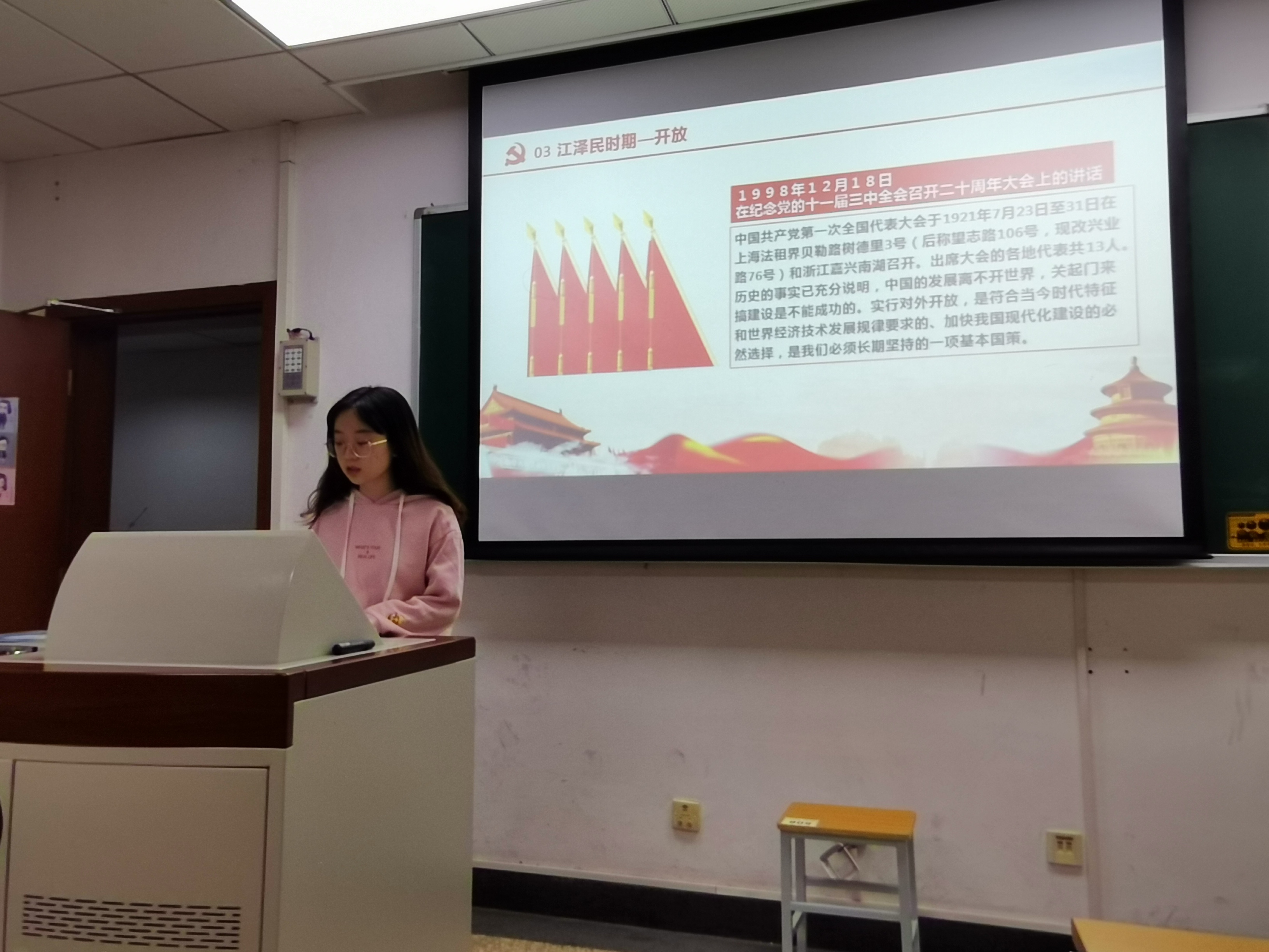 四名预备党员分别从毛泽东时代、邓小平时代、江泽民胡锦涛时代,以及新时代的中国梦四部分详细介绍新中国史。当今世界,以综合国力为基础的竞争日趋激烈,继续推进社会主义现代化建设,完成祖国统一大业,维护世界和平与促进共同发展,是党在新世纪的三大任务。抓住机遇,加快发展,实现中华民族的伟大复兴,是历史赋予中国共产党的光荣使命。党领导人民在过去近百年里写下的光辉篇章,我们坚信也一定能够在新的时期继续写出更加壮丽的篇章。