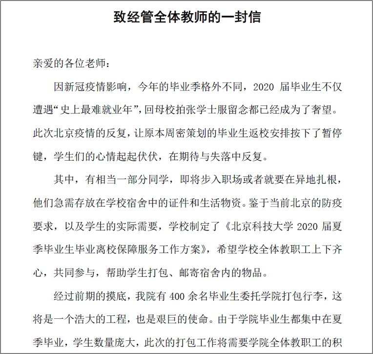 2020年的毕业季是一个特殊的毕业季,疫情之下,毕业生们无法重返校园,按照北京市新冠肺炎疫情防控的最新要求,学校及时完善了相应的毕业生离校工作方案。H片 高度重视,根据学校相关部署,第一时间成立了学院毕业生离校保障服务工作领导小组,院长和书记亲自担任组长,迅速制定学院工作实施方案,细化工作分工与进度安排,并发出《致全院教师的一封信》,鼓励全体教师积极参与。