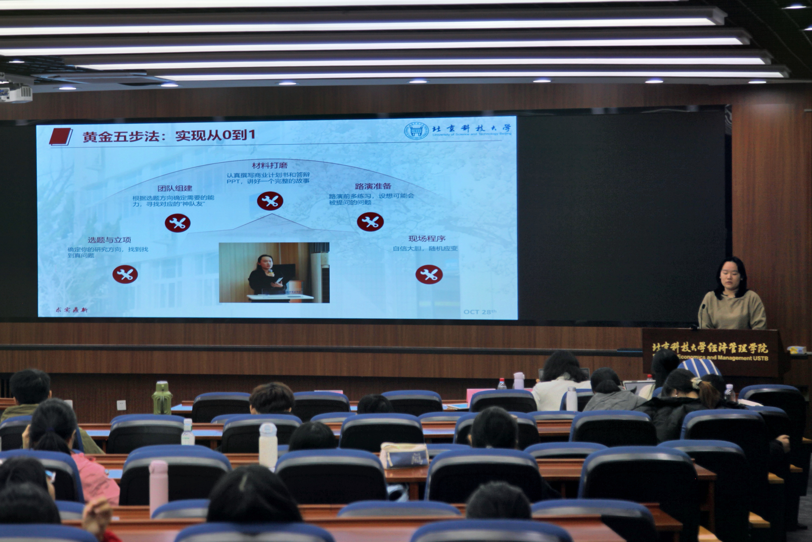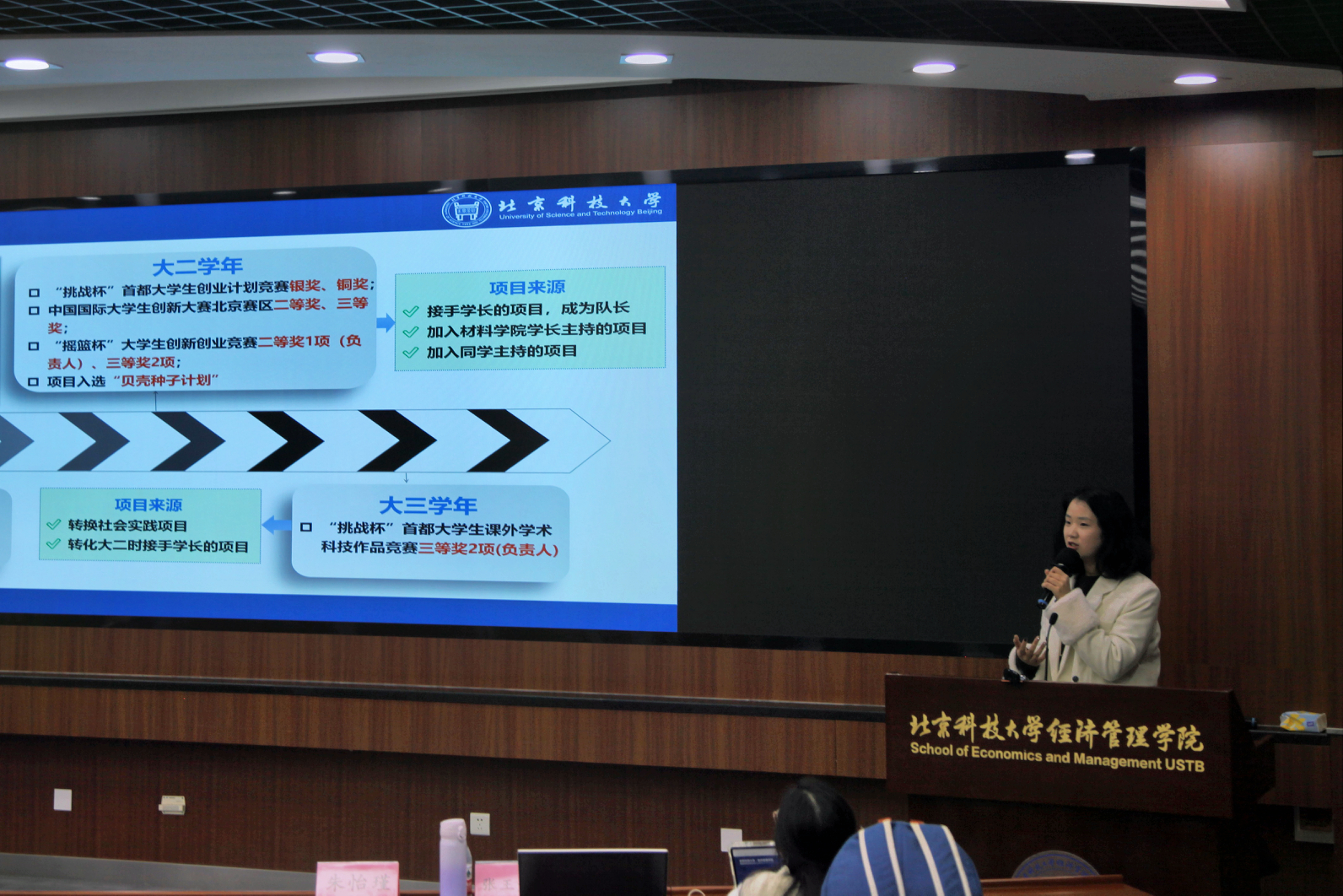 张王竞熙则是分享了自己从队员到队长的成长路径,建议低年级同学先随队积累经验,再逐步带队参赛。她强调合理规划备赛时间,注重商业计划书与PPT的迭代升级,并鼓励同学们充分吸收往届优秀项目的思路与框架,通过“继承,完善,再创新”提高参赛效率与获奖几率。