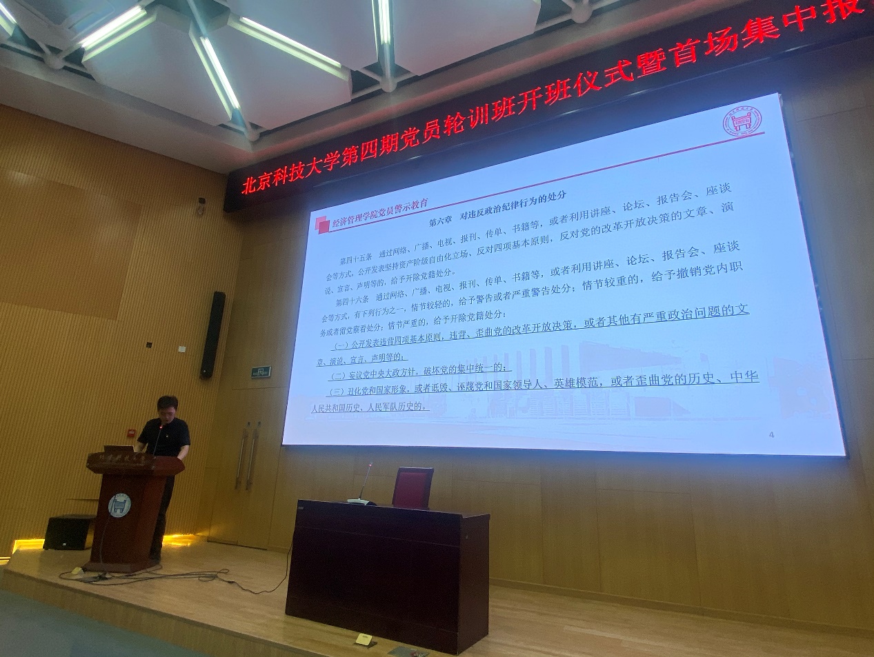 最后,学院党建辅导员张洪榛对学生党员进行警示教育,再次强调了党纪的重要性,提醒毕业生在今后要清醒面对环境,正确对待权力,谨慎社会交往,诚信科学研究,守住人生底线,要常怀一颗律己之心、常思贪欲之害。