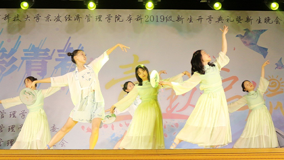 新生晚会以一段开场视频正式拉开序幕,本次新生晚会以“经彩青春 壹玖启航”为主题,以新颖多样的表演形式展现新生青春风采,整场晚会精彩纷呈。初遇篇中,工商T19的《Talent show》将篮球、足球、跆拳道搬上了舞台,管理1904的小品《一念天堂》笑点满满,工商1904的同学们将乐器演奏和舞蹈相结合为我们带来了《今天我们开始欢沁》,工商1905带来一曲《最美的太阳》,节目巧妙的编排,精心的设计,都为我们展示着青春风采。