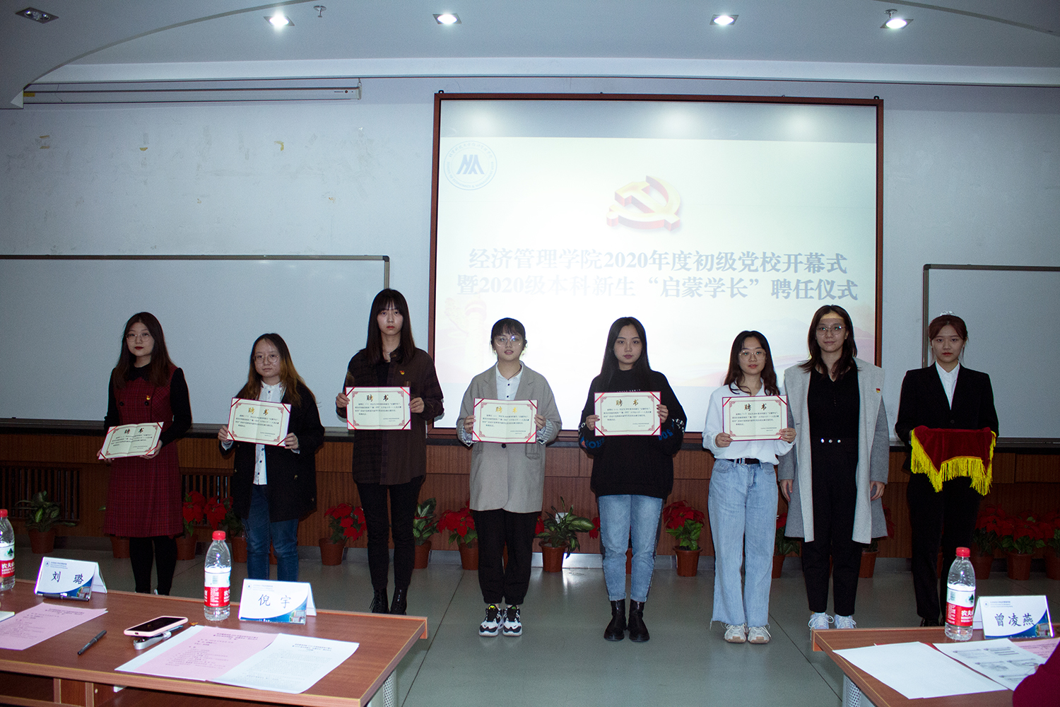 为了引导提交了入党申请书的2020级本科生坚定马克思主义信仰,增强对党的性质、宗旨和历史使命的认同,进一步端正入党动机,H片 于10月28日晚18:30在经管楼312、313举行了2020年度初级党校开幕式暨2020级本科新生“启蒙学长”聘任仪式。出席嘉宾有党校副校长、学院党委副书记倪宇,学院党委秘书曾凌燕,党建辅导员刘璐,党校班主任王琳茹,党校班主任邹艺,开幕式由党校办公室张洪榛主持。