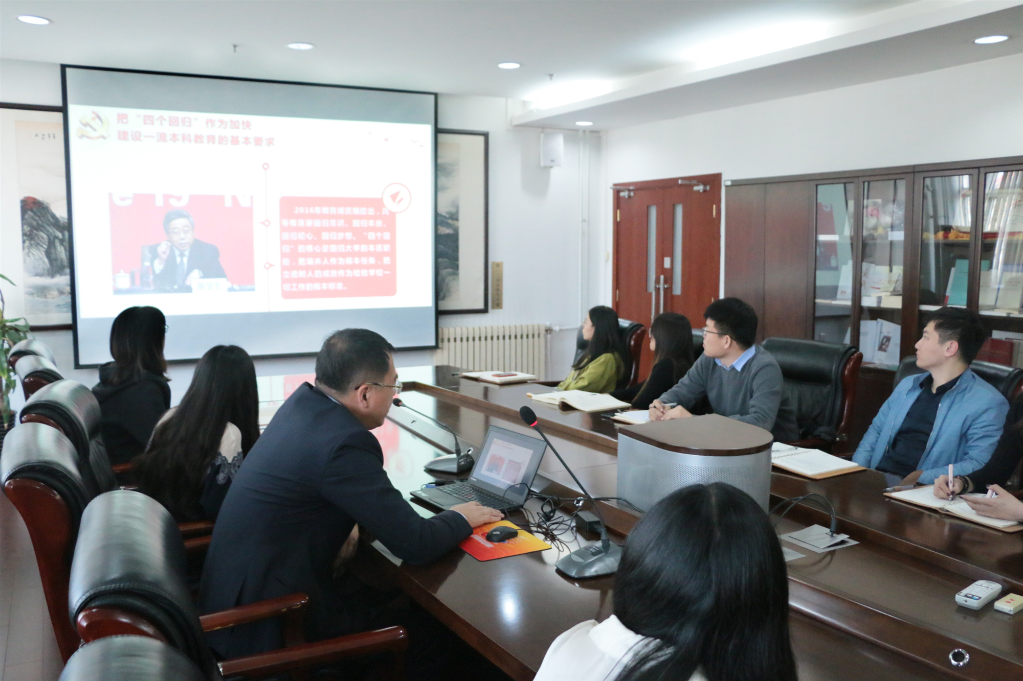 为全面深入开展“不忘初心,牢记使命”主题教育活动,激励辅导员队伍自觉增强政治担当、历史担当、责任担当,东凌H片 院长闫相斌于10月18日下午3点在经管楼809,以《教育报国守初心,办好中国特色社会主义大学》为题讲授了一堂生动的党课。学院党委副书记倪宇、学工办全体辅导员参加。闫相斌在授课中紧紧围绕“不忘初心、牢记使命”主题教育总要求,从四个方面进行了深入解读。