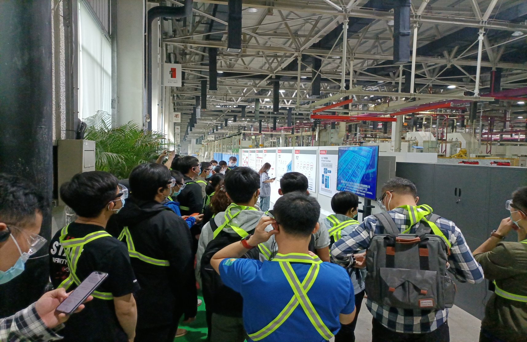 在清晰了解福田康明斯这个中外合资的企业背景之后,同学们进入车间。在进入车间之前福田康明斯对于安全生产有严格的要求,所有人员需按照规定佩戴眼镜及醒目的安全服,防止车间的飞溅等意外伤害。
