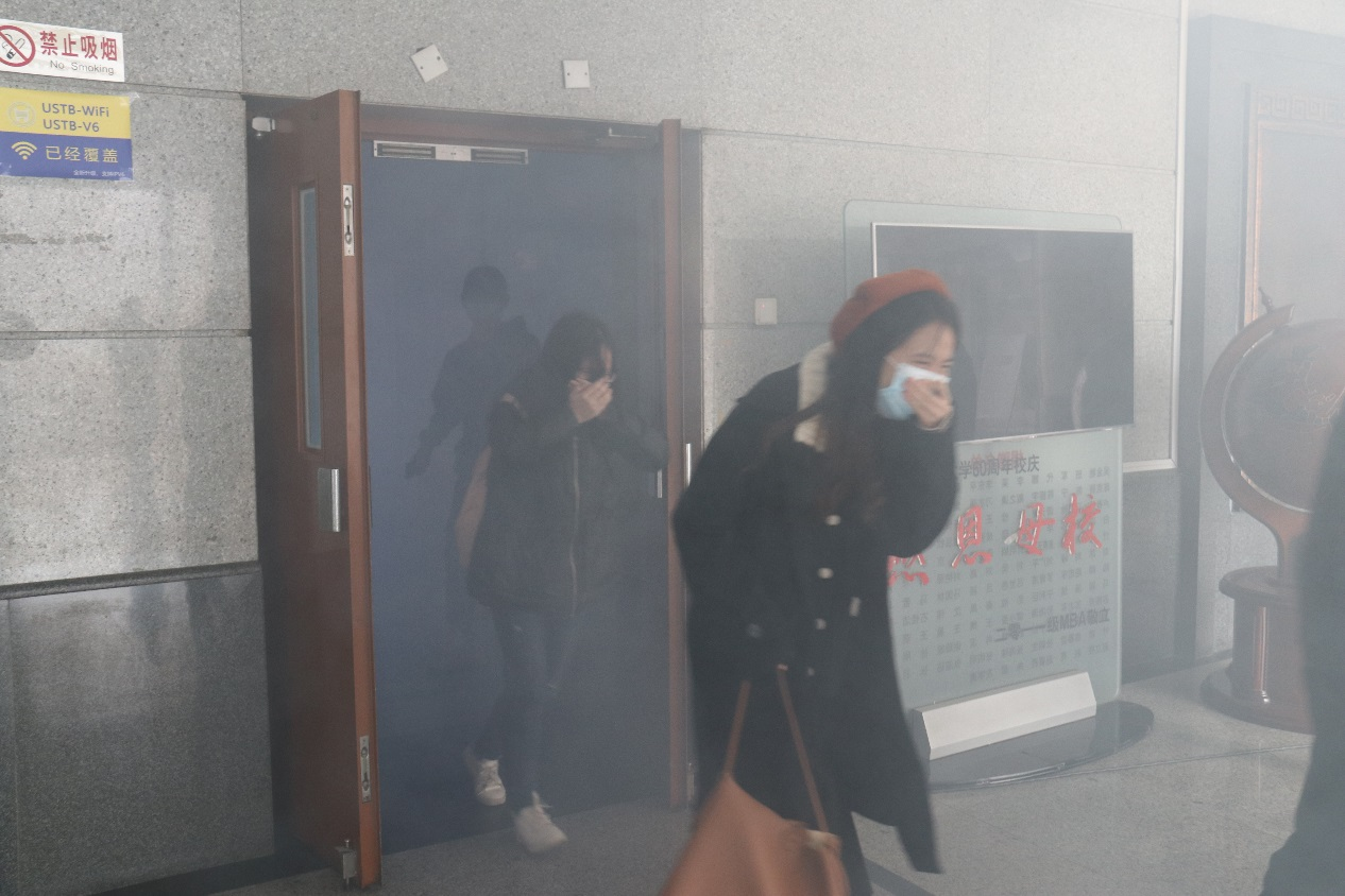 消防安全疏散演练活动于中午11:15正式开始,各楼层引导员于指定的位置集合待命,接到本次活动总指挥王晨副处长的指令后,白色烟雾开始在楼内蔓延,急促的警报声响起,演练正式开始。各楼层安全员随即按照预定方案迅速向指挥组报告火情,并在楼内消防疏散广播的提示下,组织师生有序撤离。学院近150名师生员工在各楼层引导员的引导下纷纷用湿毛巾捂住口鼻、俯身迅速从楼梯、疏散通道向外转移。参与消防安全疏散演练的师生员工在短时间内全部安全疏散,演练取得了圆满成功。