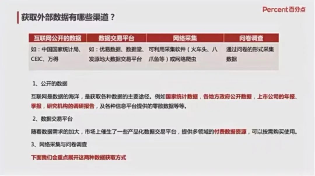 第二部分,乔老师在对获取数据进行了一个简洁的概述之后,将企业获取数据分为内部数据和外部数据,乔老师重点从外部数据获取的渠道细分,分析不同的渠道获取数据的优劣性,并通过对企业的实例分析,提取企业的运行信息进行基础项目的讲解。乔老师让同学们先从企业的背景分析入手,学会运用基础的工具来大致提取企业的相关信息。