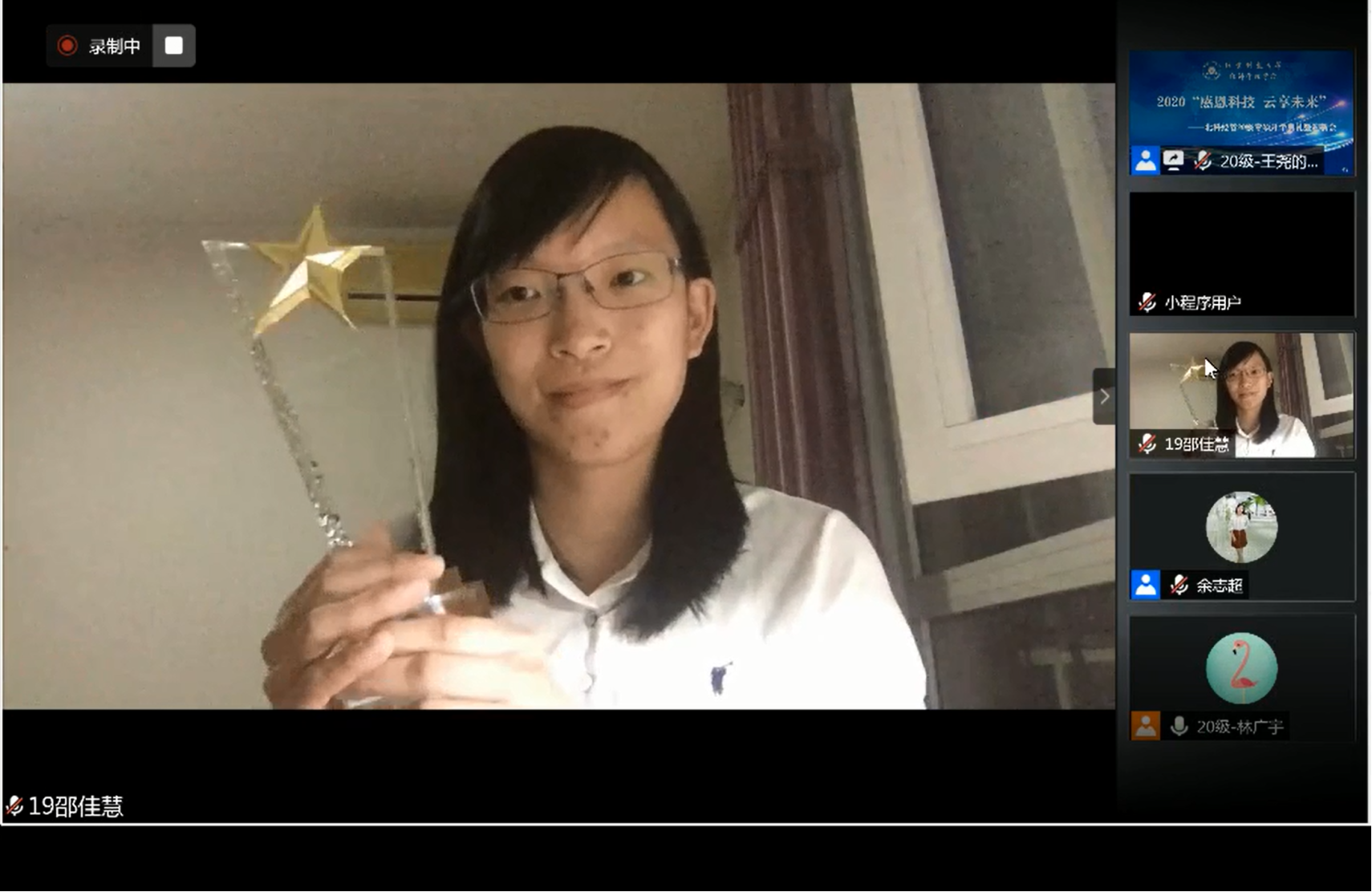 激动人心的颁奖环节中,学院副院长黄晓霞教授宣读了 2019 级优秀社群管理员名单。邵佳慧等9名学姐、学长获得了荣誉证书和奖杯。社群部是一个无私奉献、充满责任感的集体,他们为学弟、学妹的成功提供了最全面的备考心得和无微不至的帮助辅导。每一个新同学都感恩学姐、学长的一路温暖相伴,这种乐于奉献的精神也会在一代代贝壳人中永远传承。