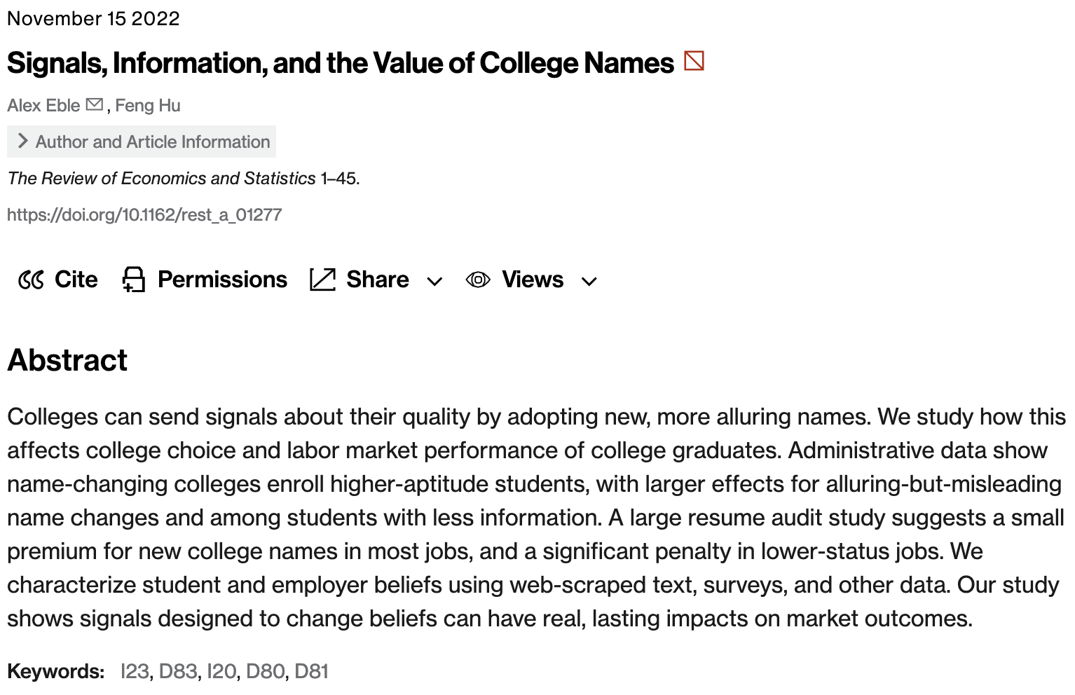 近日,我院工商管理系胡枫教授作为论文共同第一作者,与美国哥伦比亚大学 Alex Eble 助理教授合作撰写的学术论文Signals, Information, and the Value of College Names(中译:信号、信息与大学名称的价值)在经济学国际顶级期刊Review of Economics and Statistics发表。