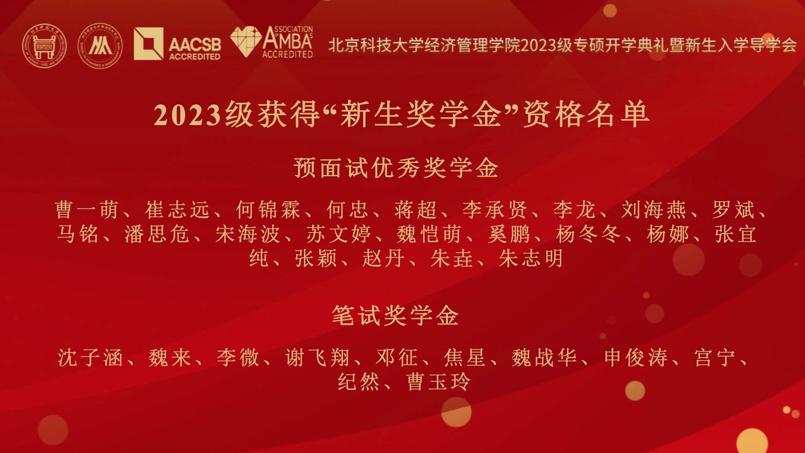H片 党委书记武森宣读了“2023级新生奖学金”资格名单。千淘万漉虽辛苦,吹进狂沙始到金,共22名学生荣获预面试优秀奖学金、11名学生荣获笔试奖学金。希望同学们奋发图强,积极进取,迎接崭新的未来。