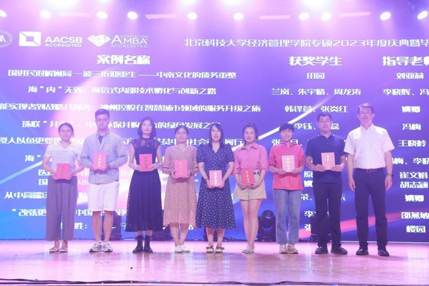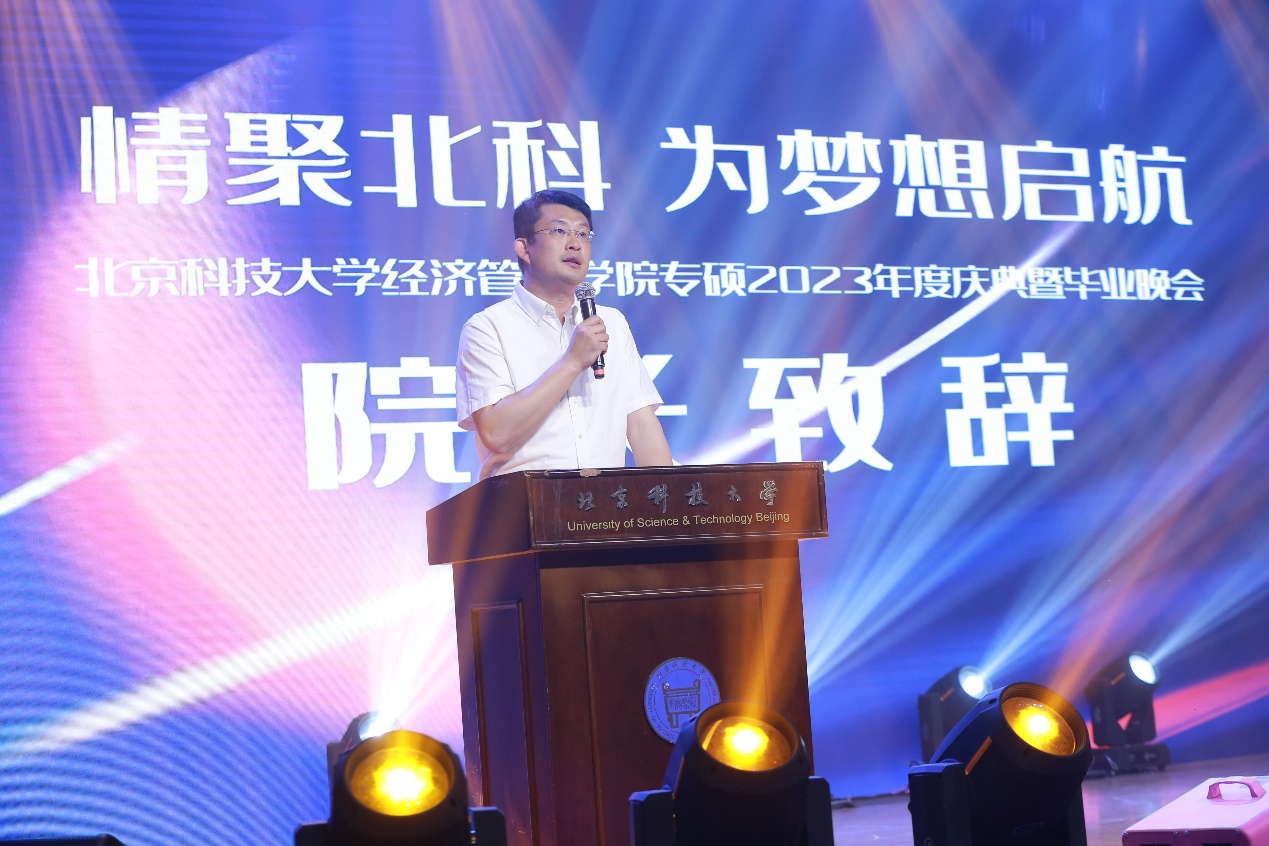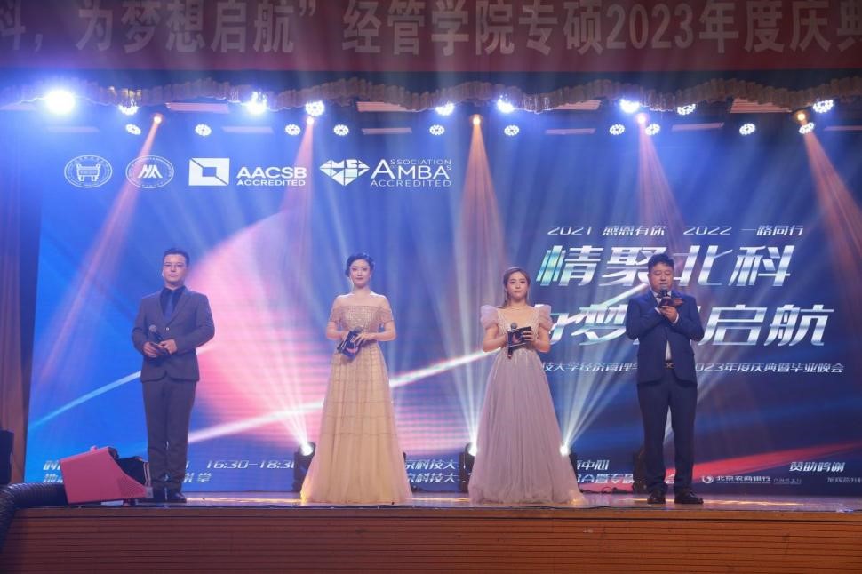 2023年6月18日,“情聚北科,为梦想启航”——H片 2023年度庆典暨毕业晚会在教职工礼堂隆重举行。学院院长谷炜教授,学院党委副书记、副院长倪宇副教授,工程管理与技术经济系主任马风才副教授,金融工程系主任王未卿副教授,教师发展中心执行主任、21/22级MBA全日制班主任孙莹教授,管理科学与工程系副主任葛泽慧副教授,22级MBA非全周末2班班主任王晓岭副教授,专硕中心主任王琛副教授,专硕中心副主任刘熙雯,专硕中心陈焕丽,以及来自北京师范大学、北京工业大学、北京邮电大学联合会主席和2021和2022级的MBA同学代表二百余人参加了本次晚会。晚会同步进行在线视频和相册直播,观看总人次累计近2000次。