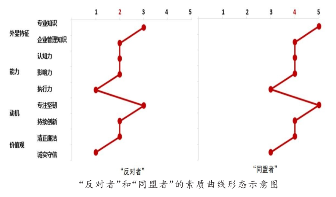 之后,谢教授通过三张示意图,清晰地讲解了利用360度评价工具得到的重要发现。第一张示意图是针对有人质疑360度评价会存在因关系亲疏造成评价尺度不一的问题。谢教授介绍到,在对其调研的公司历年360度评价结果的研究中发现,关系亲疏造成评价尺度不一的问题并不会影响360度素质曲线的形态。尽管“反对者”和“同盟者”打分的基准线不同,但是二者在对于被评价管理人员素质优劣项的认知上大体一致,所呈现的曲线形态相似。所以他提示同学们:关系有亲疏,曲线恒可信。