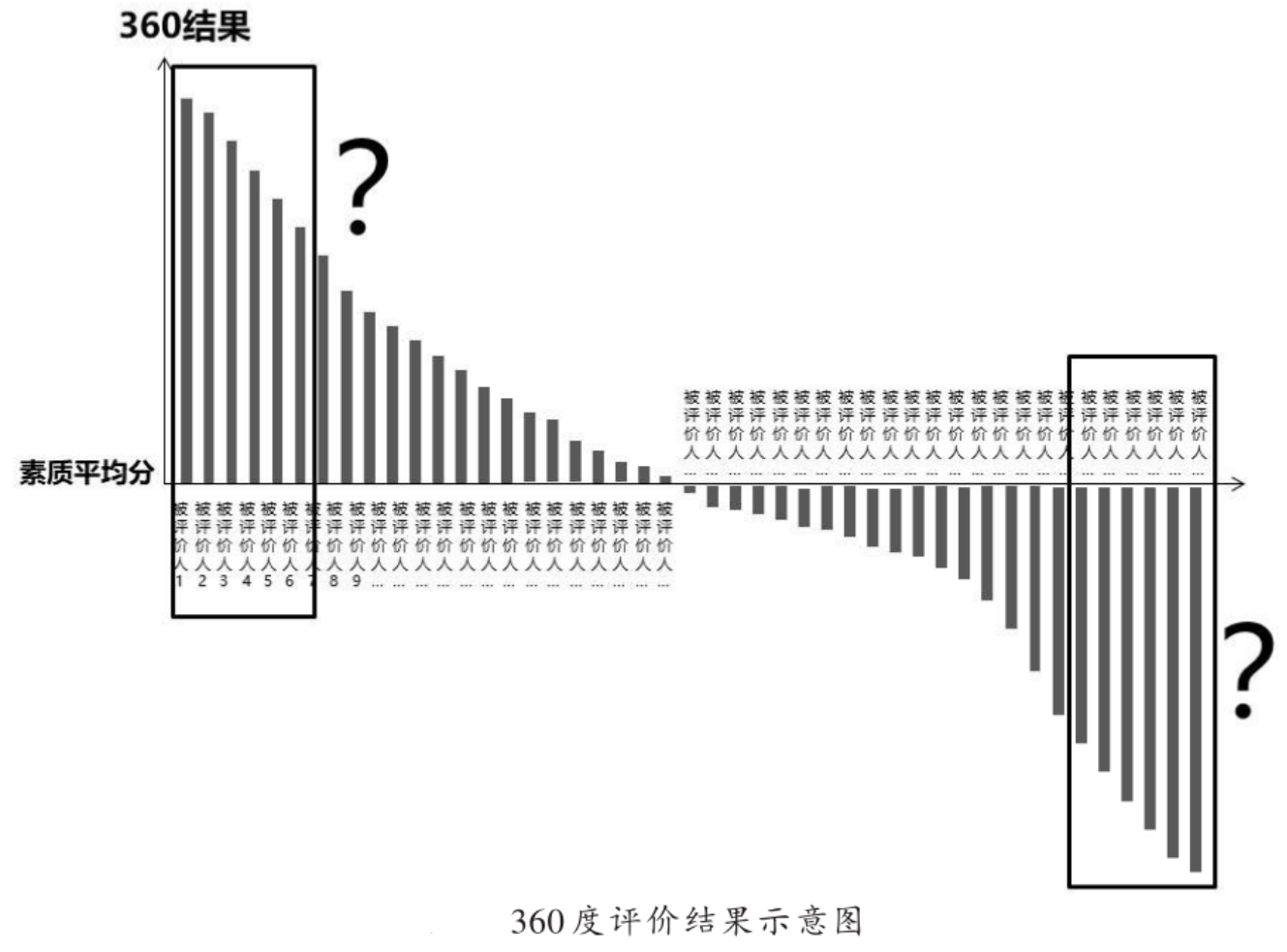 第三张示意图显示的是经过360评价后被评价人的整体排名。研究发现,那些至少2次排名在后20%的管理人员中,有79.5%的管理人员历年从未出现在360度排名的前20%梯队中。可见360度评价常年分数低的管理人员,大多数素质评价不会出现明显的提升。
