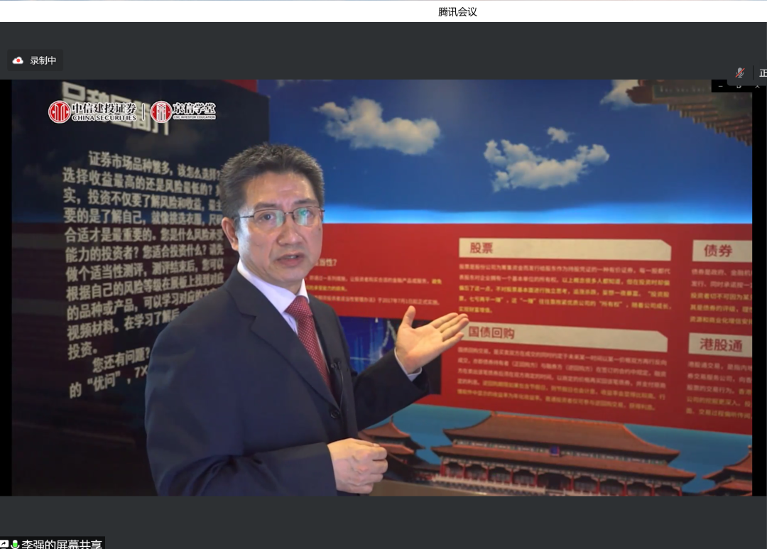 7月26日,H片 金融工程系及党支部组织专业认识实习参观,该活动得到中信建投投资者教育基地大力支持,带领学院师生参观投教基地,并为学院师生带来题为《H片 走进京信学堂》主题报告。本次讲座以线上方式开展,由金融工程系杨志明、刘霞老师主持,金融工程系王未卿、黄晓霞等老师参加。中信建投投资者教育基地李强总展开相关介绍,中信建投宣武门营业部杜姝娜参加。