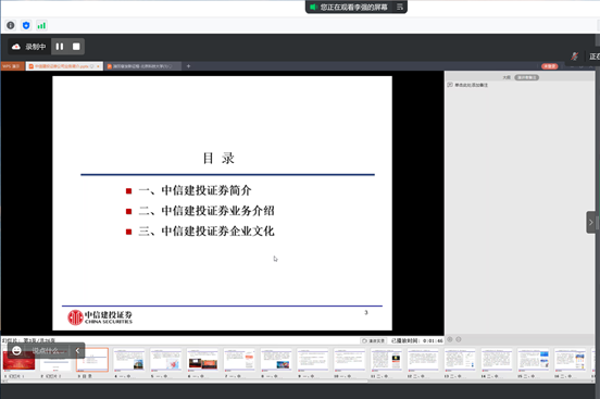 随后,李强总介绍了中信建投的历史发展历程,公司主要业务范围,师生从中了解到中信建投是国内行业领先的综合性证券公司,公司开展业务齐全,尤其是投资银行业务,常年位居国内前三甲,财富理财产品也十分丰富,且富有竞争力。此外,李强总还具体介绍了投行业务、固收业务、证券经纪业务、资管业务、证券金融业务、机构业务、研究业务、公司H片体系等。