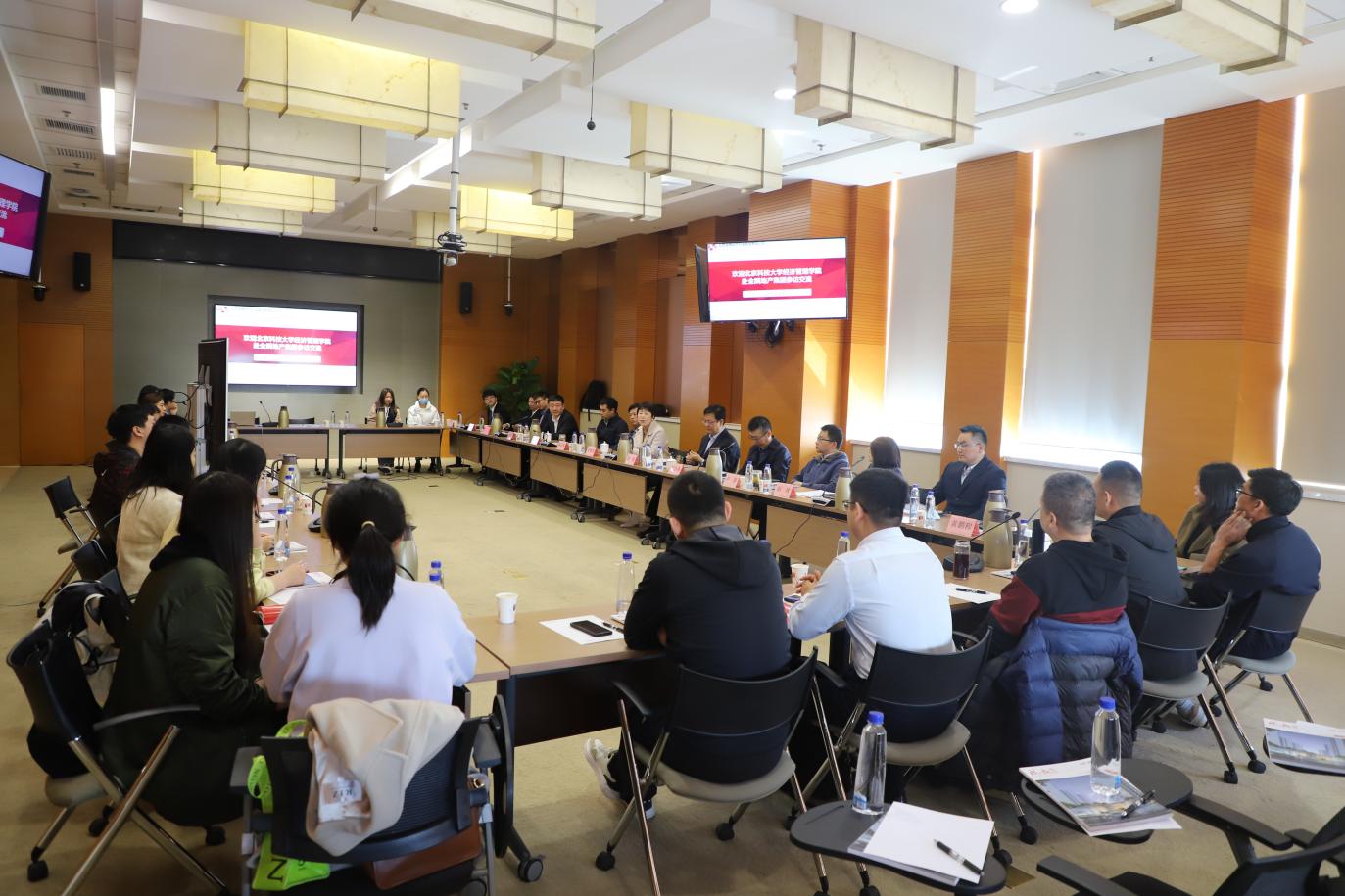 会上,校企双方围绕房地产开发业务为背景开展讨论,金隅地产集团南京管理中心前期设计总监、北科大2012级校友郝楠分享了房地产开发流程和设计前沿思考;金隅地产集团北京管理中心十八里店项目副总经理李月对合资公司合作展开步骤和管理进行了介绍;金隅地产集团北京管理中心专业工程师、北科大2020级校友李锡明分享了工作经历和感受,为学校发展建言献策。我院师生就地产行业发展形势、智能家居、“双碳”目标、公司人才管理等相关领域问题进行了提问。金隅地产集团副总经理、北科大校友田以刚、北京金隅集团部室领导、2021级MBA研究生刘昌盛、黄谦结合主管工作对相关问题进行了深入的交流。