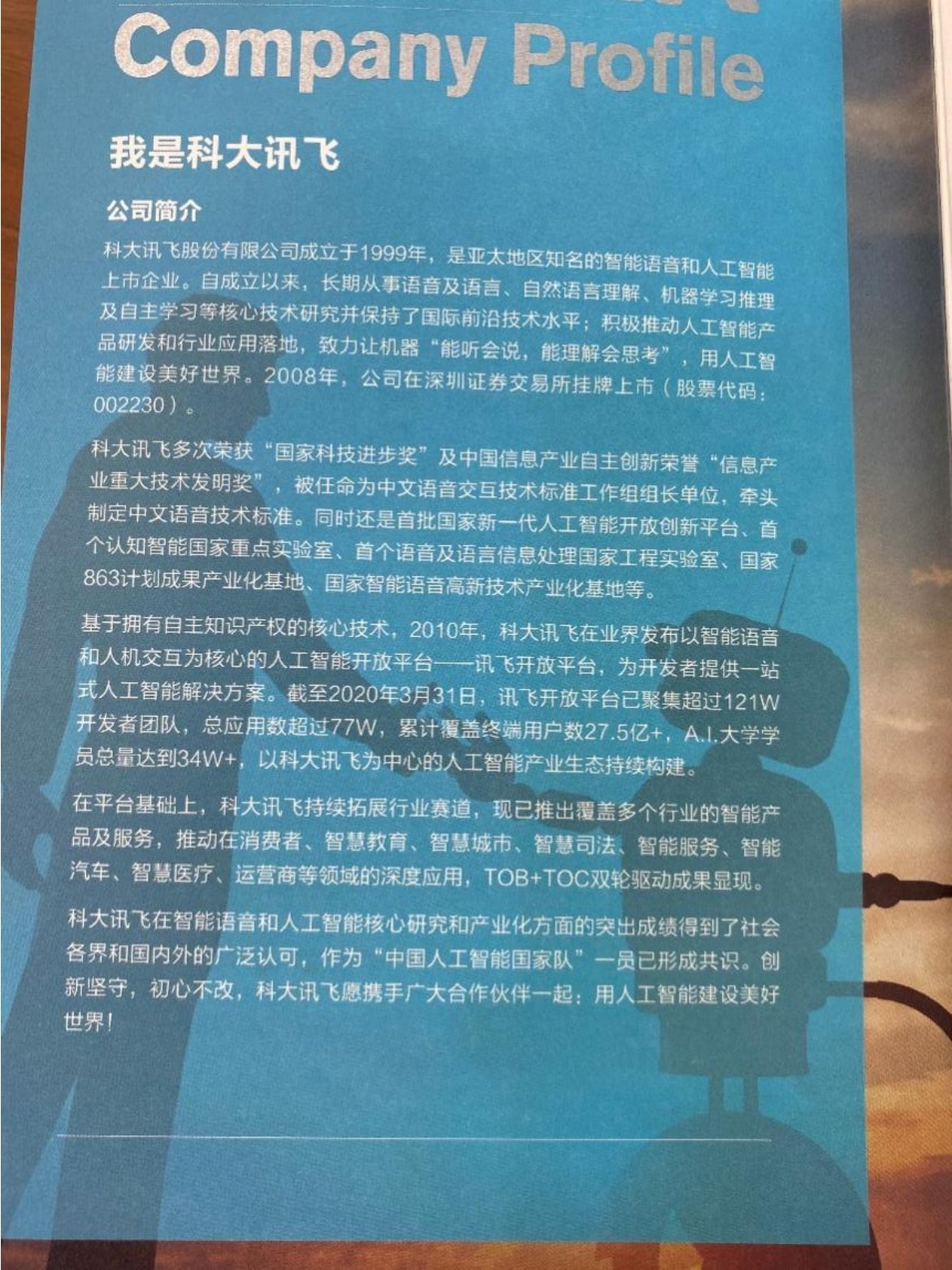 科大讯飞股份有限公司成立于1999年,是亚太地区知名的智能语音和人工智能上市企业。自成立以来,长期从事语音及语言、自然语言理解、机器学习推理及自主学习等核心技术研究并保持了国际前沿技术水平;积极推动人工智能产品研发和行业应用落地,致力让机器“能听会说,能理解会思考”,用人工智能建设美好世界。经过多年的发展,科大讯飞正在逐步达成这个目标并且现在可以在中国智能语音市场占有率排名第一,在多个重要细分领域市场占有率超过60%。